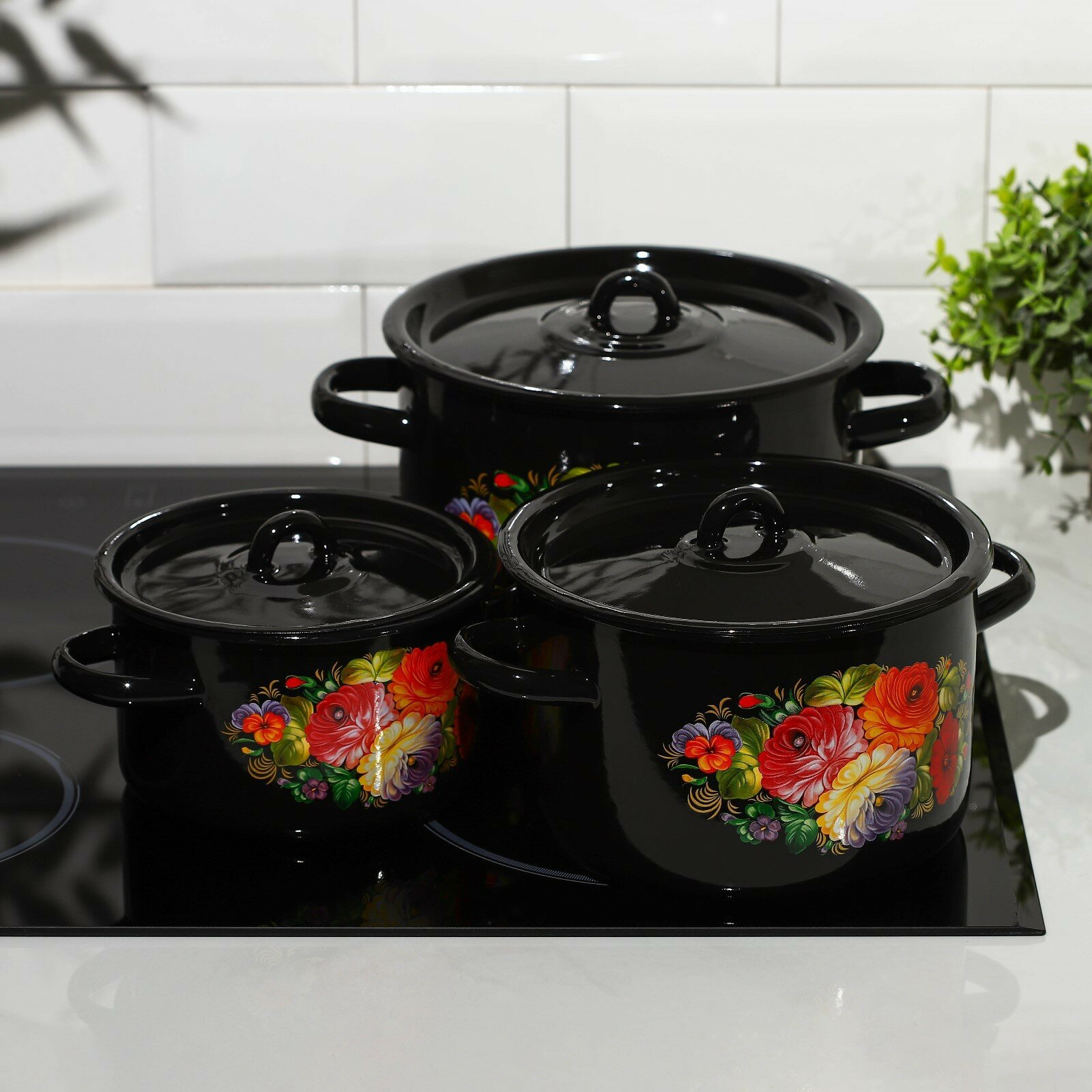 Набор кастрюль «Жостово», 3 предмета: 1,5 л, 2,9 л, 4,5 л, эмалированные крышки, индукция