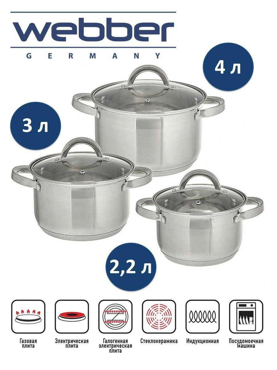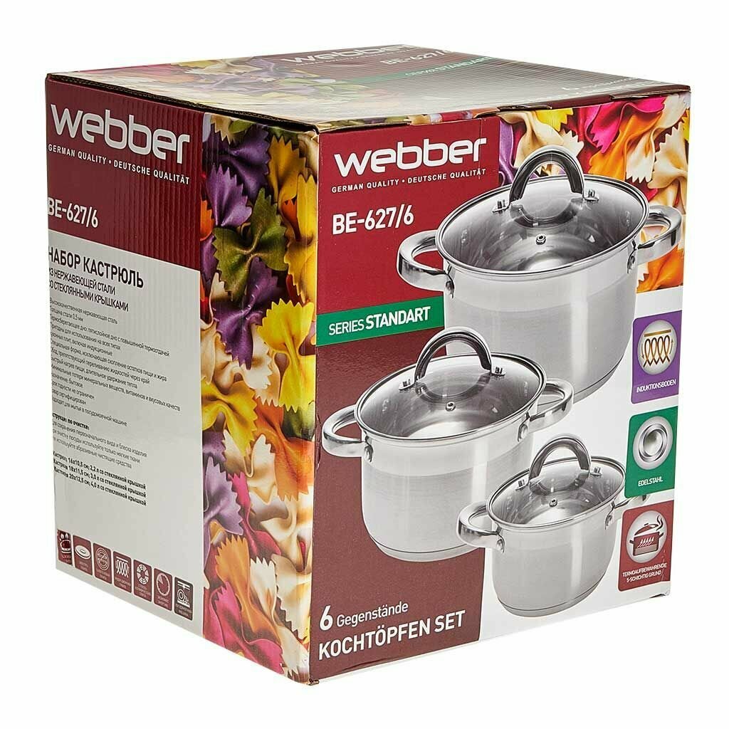WEBBER BE-629/6 Набор посуды из нерж. стали 6 пр. 1.9л, 2.7л, 3.7л со стеклянными крышками