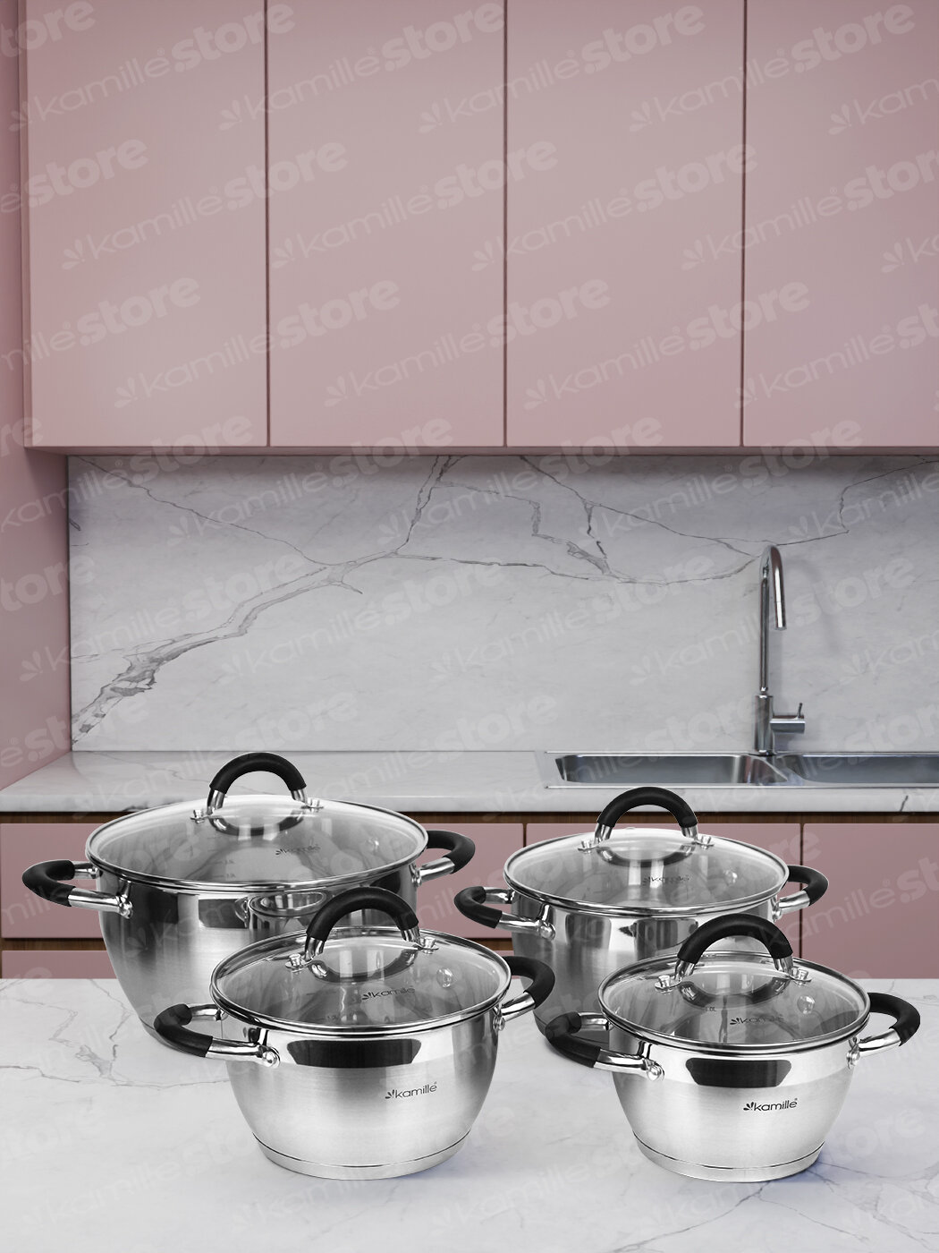 Купить Набор кастрюль 8 предметов из нержавеющей стали Kamille KM 5755 (1,8 л; 2,5 л; 3,5 л; 5,3 л) с силиконовыми вставками на ручках (серебристый)