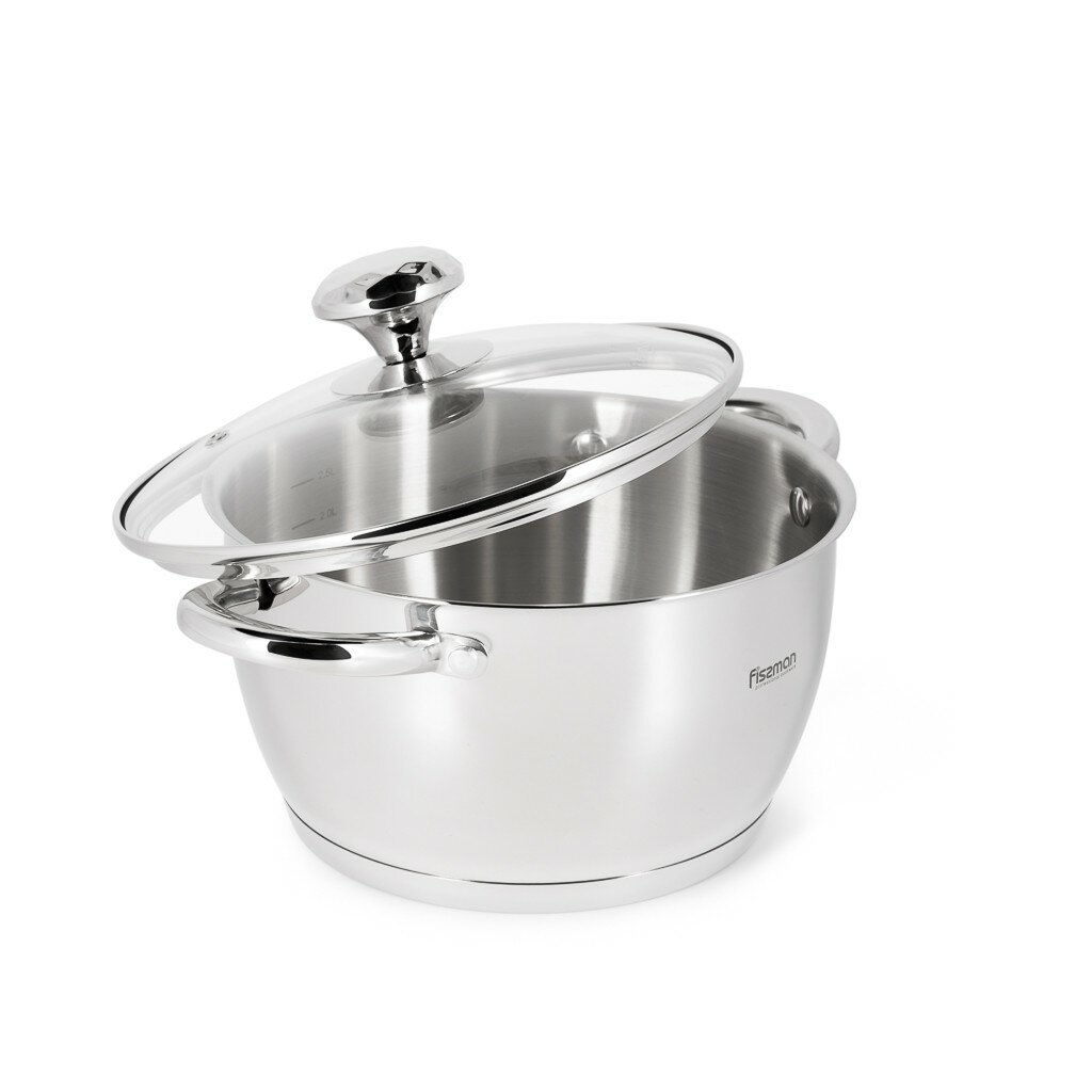5833 FISSMAN Набор посуды FALCON 6 пр.(нерж. сталь) Ковш 14х7см - 0,7л; Кастрюля 16х9см - 1,5л; Кастрюля 20х11см - 2,8л нерж.сталь; Крышки стекло; Индукция; Термоаккумулирующее многослойное дно.