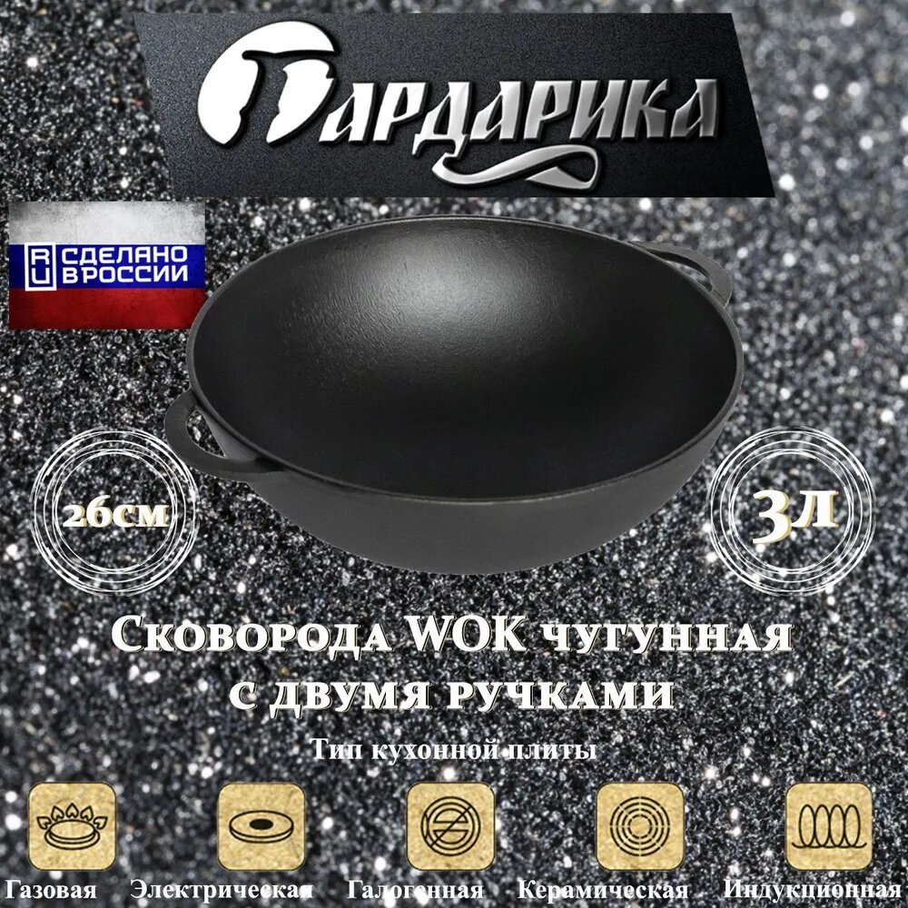Сковорода Вок чугунная 26 см с двумя ручками Гардарика