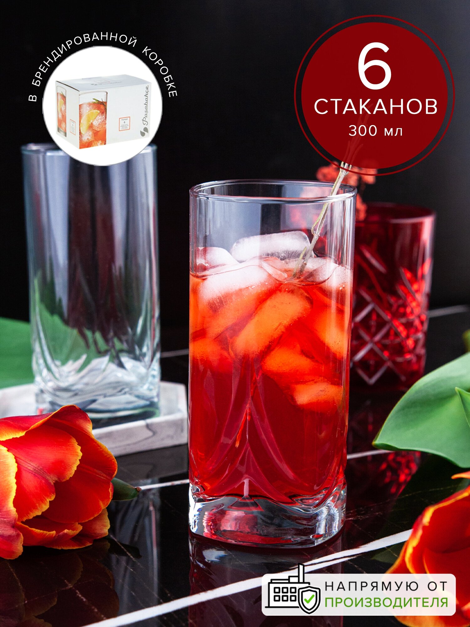 | Дополнительная информация | Стаканы высокие стеклянные бренда Pasabahce, набор 6 шт., объемом по 300 мл. |