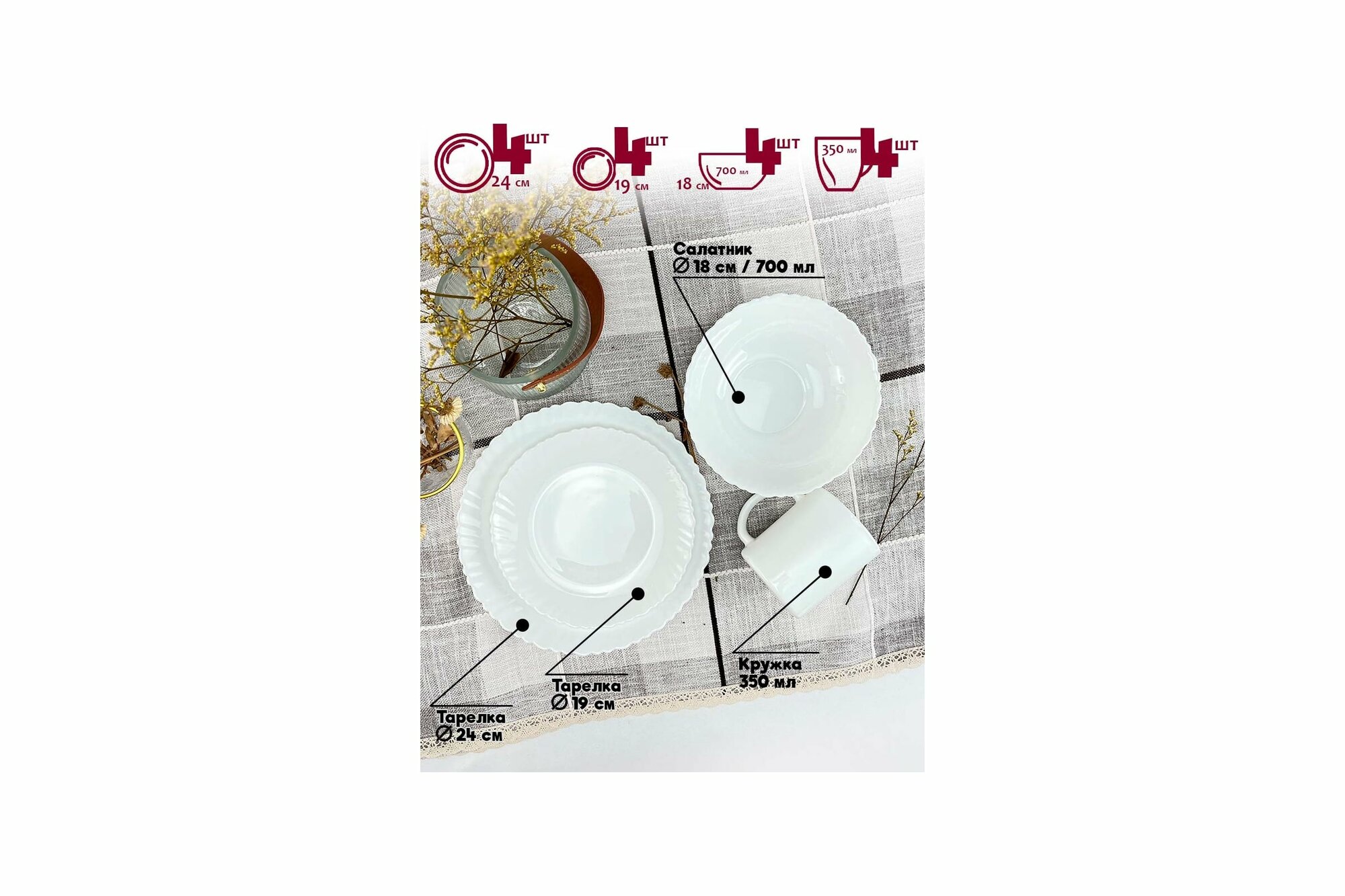 | Комплектация | обеденная тарелка 27 см - 4 шт., тарелка 19,5 см - 4 шт., салатник 15,5 см - 4 шт, кружка 350 мл - 4 шт. |
