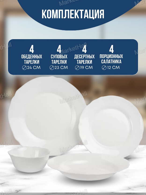 | Комплектация | тарелка обеденная 25 см - 4 шт., тарелка суповая 20 см - 4 шт., тарелка десертная 18 см - 4 шт., салатник 16 см - 4 шт |