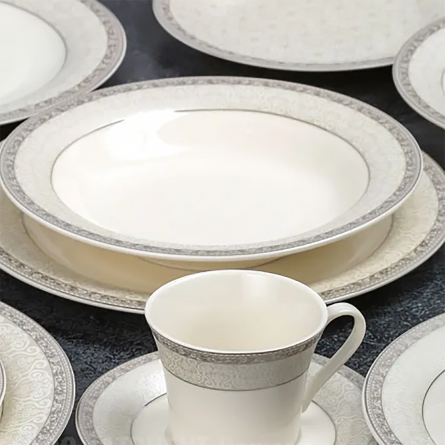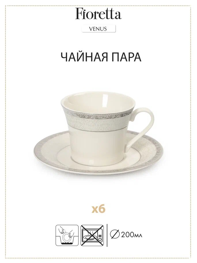 | Комплектация | 6 обеденных тарелок 27 см, 6 суповых тарелок 22 см, 6 десертных тарелок 19 см, 6 чайных пар (блюдце + чашка 220 мл) |