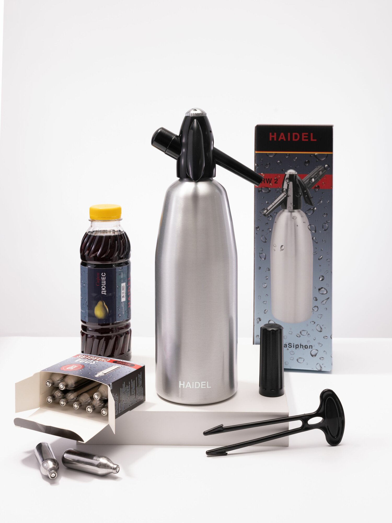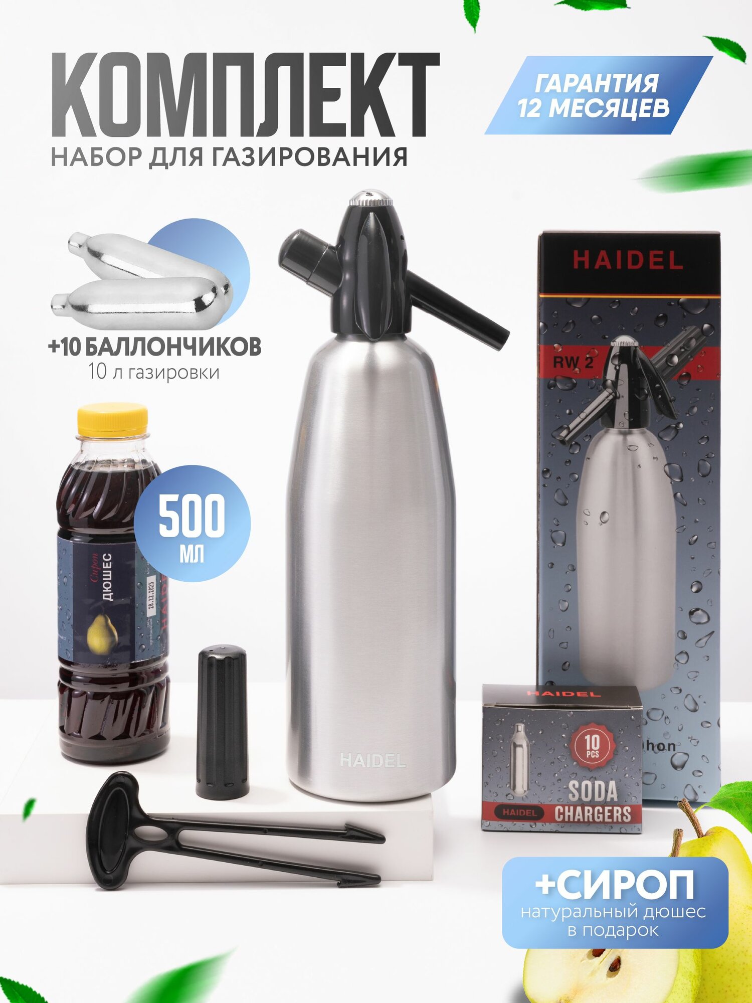 Сифон для газирования воды, 10 баллончиков + сироп для приготовления 5 л натурального лимонада, HAIDEL RW 2, серебристый интересное: