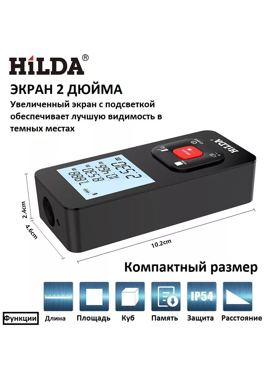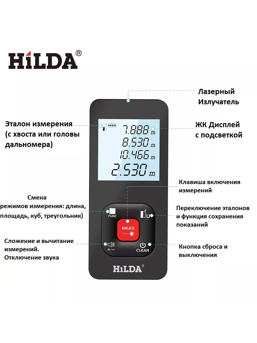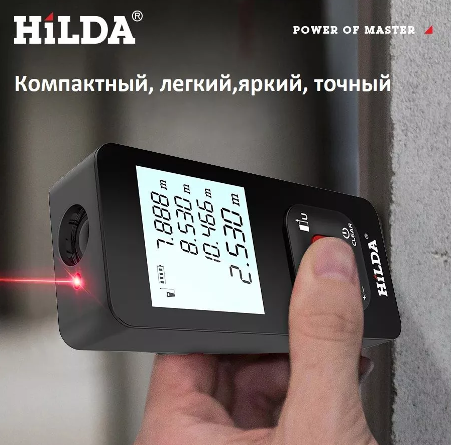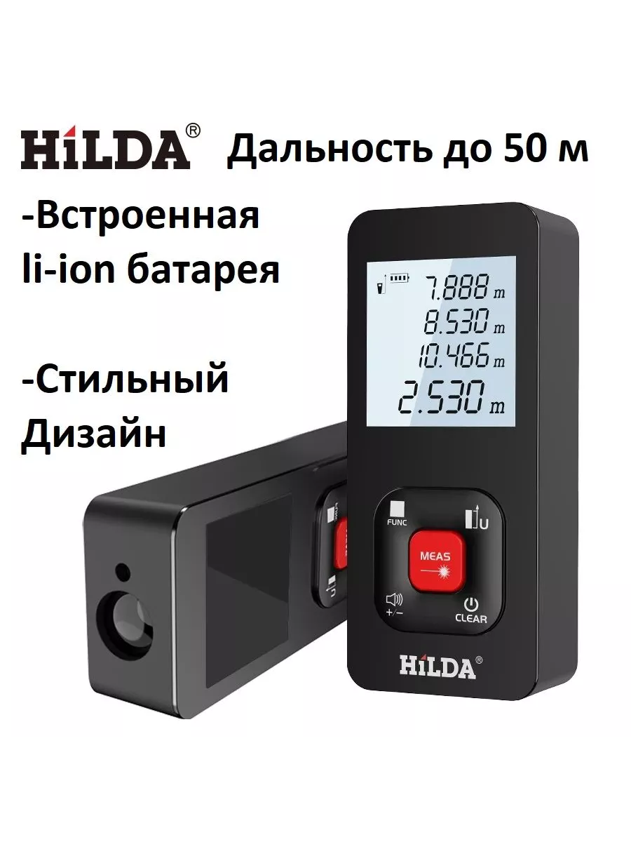 Лазерная рулетка Hilda с дальностью измерения до 50м без отражателя интересное:
