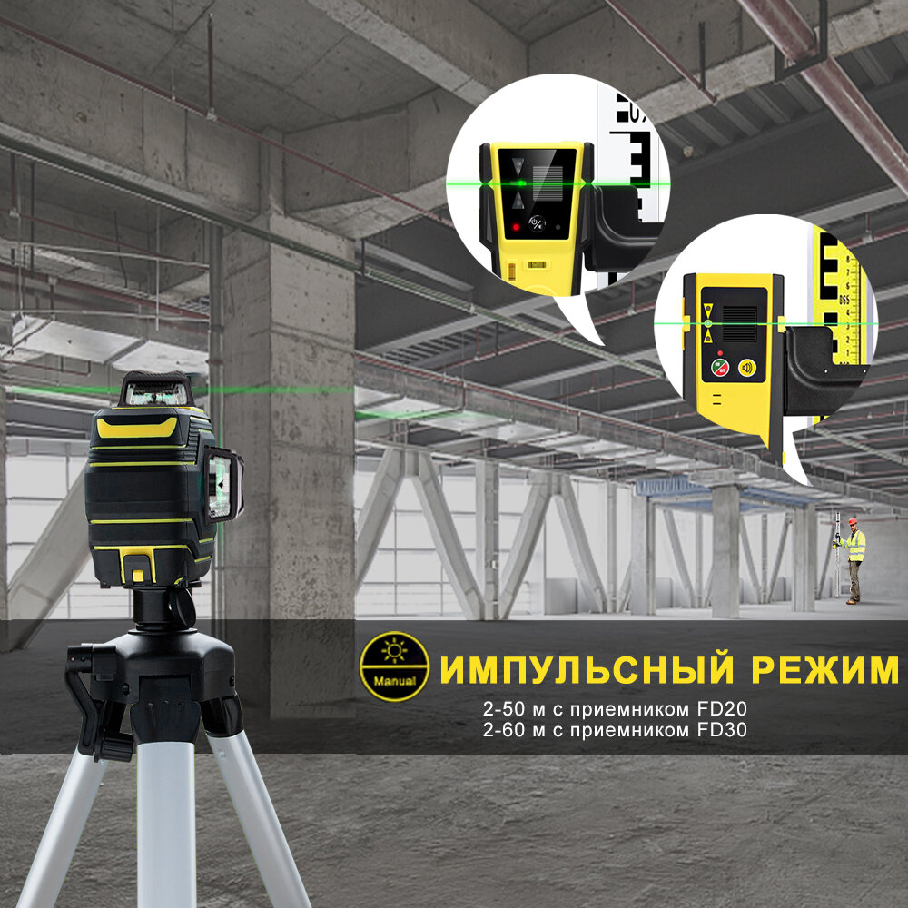 Лазерный уровень/нивелир 360 FIRECORE F94T-XG, Зеленый луч 3D 12 линий с приемником FD30