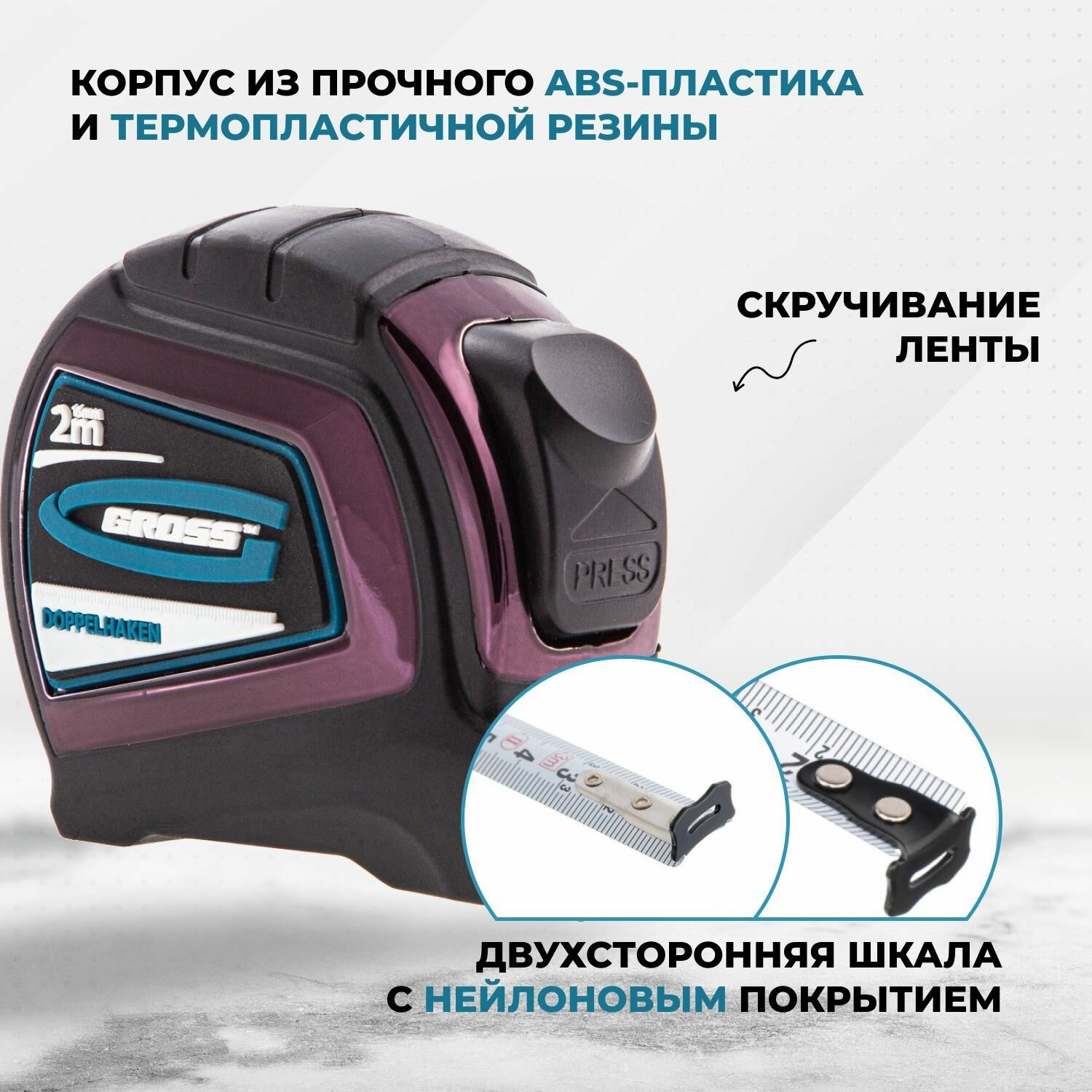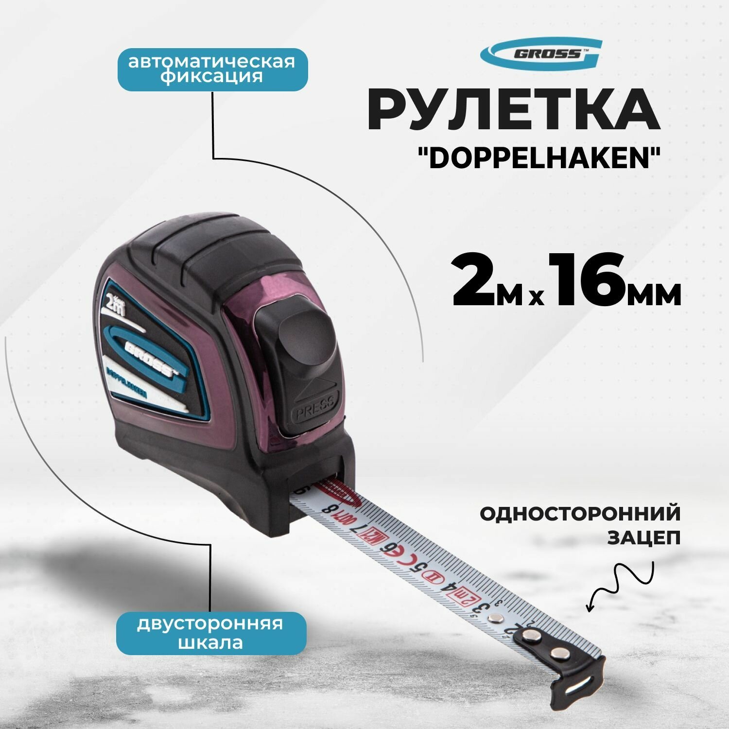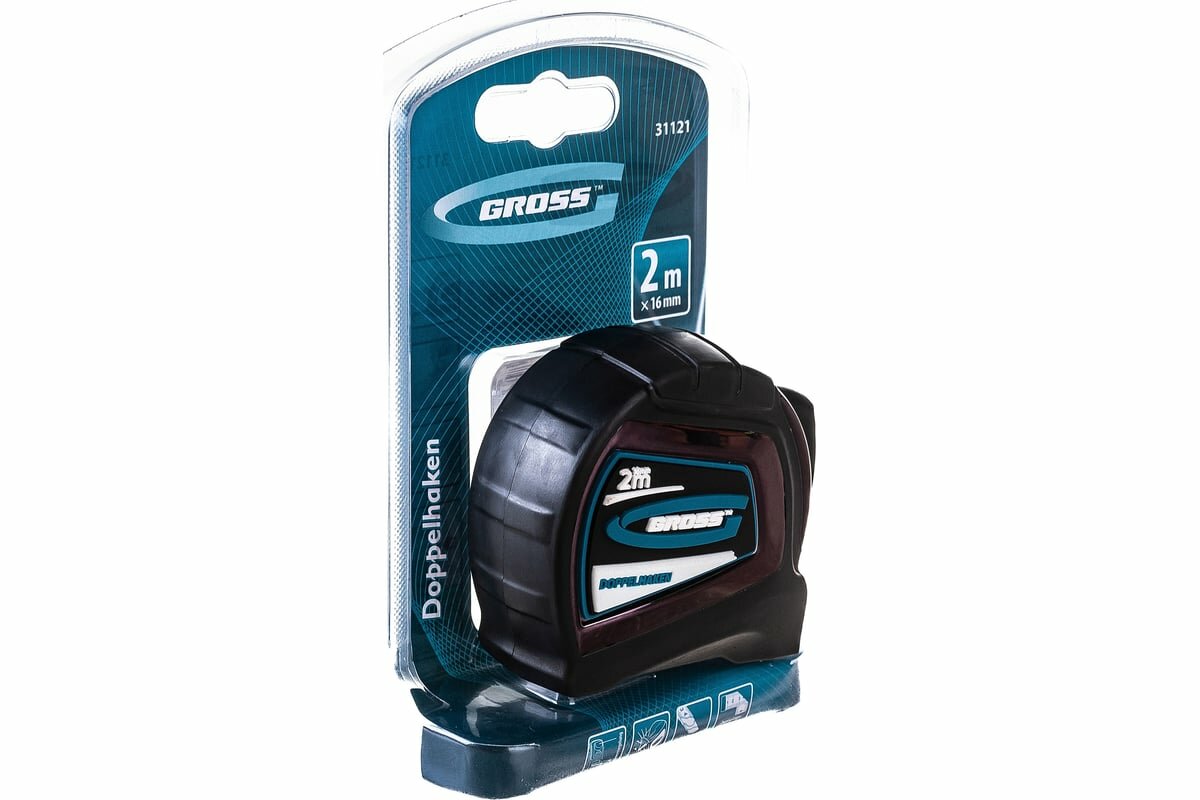 Рулетка Gross "Doppelhaken", 2 м x 16 мм, односторонний зацеп, нейлон, двуст. шкала, автоматич, 31121