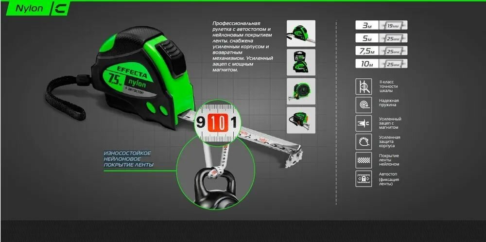 Рулетка Effecta Nylon -7,5м/25 мм с магнитом, автостопом, лентой нейлон