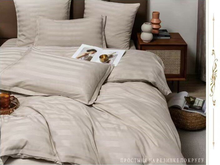 Постельное белье евростандарт 2-спальное/ евро CandiesMency Страйп сатин простынь на резинке 180x200+25 , бежевый