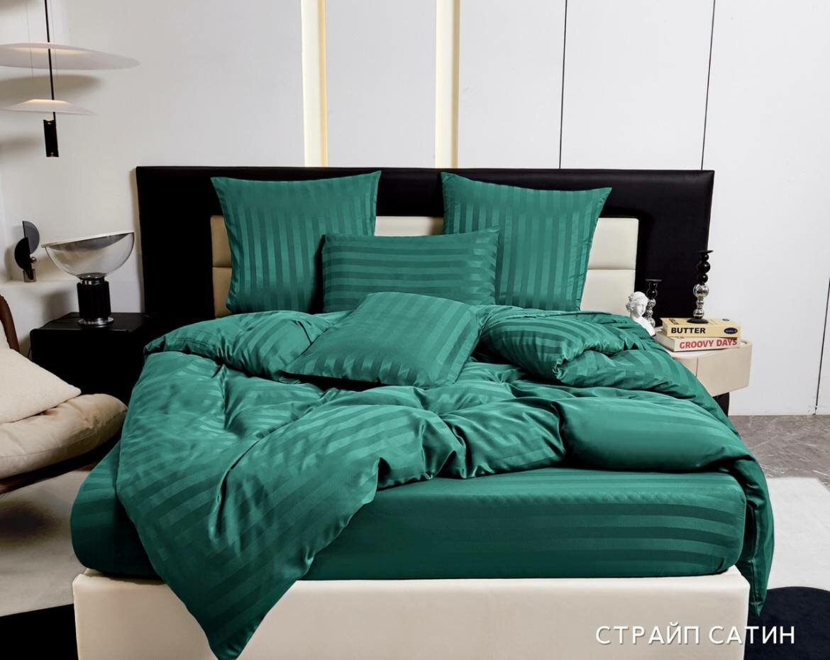 Постельное белье евро двуспальное зеленый BorisMency страйп сатин простынь на резинке 180x200+25, пододеяльник 200x220, наволочки 50x70-2, 70x70-2