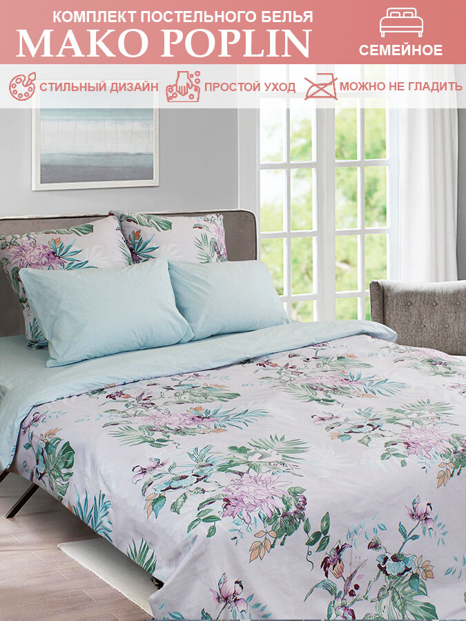 Постельное белье семейное с цветочным принтом Cleo MAKO POPLIN, поплин, наволочки 50x70 и 70x70