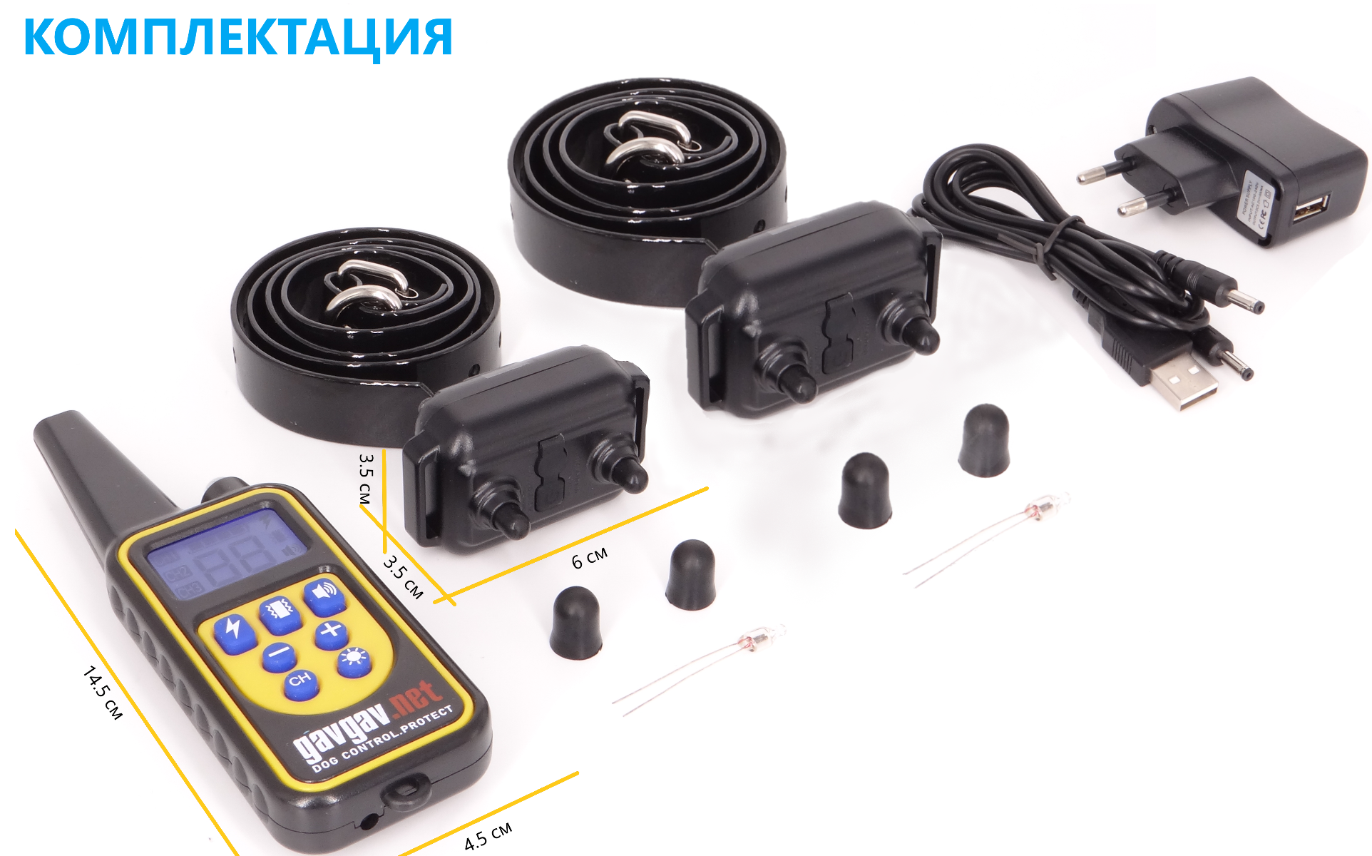 | Комплектация | ● Ресивер (приемник сигнала) ● Пульт-передатчик ● Тест-лампа ● Удлиняющие колпачки на электроды x 2 шт ● Регулируемый по длине ошейник из полиуретана (от 14 см до 67 см окружности шеи) ● Зарядное устройство (вход: 100-240 ~ 50/60 Гц, выход: 5 В 1000 мА или 500 мА) ● Зарядный кабель с двумя штекерами (одновременная зарядка пульта и ресивера) ● Подробная инструкция на русском и английском языках ● Коробка |