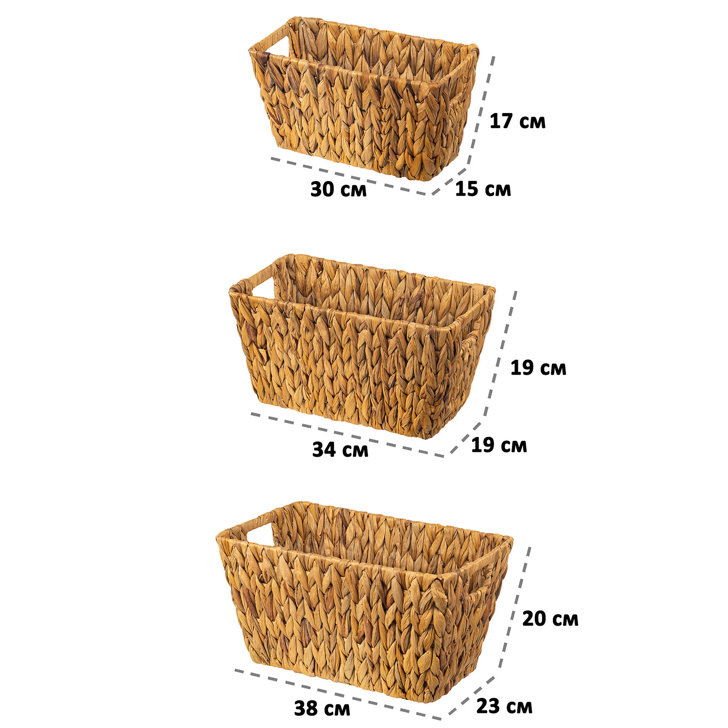 | Дополнительная информация | Набор 3 плетеных корзинок 38*23*20 см с ручками, 1 корзинка - 38*23*20 см, 1 корзинка - 34*19*19 см, 1 корзинка - 30*15*17 см |