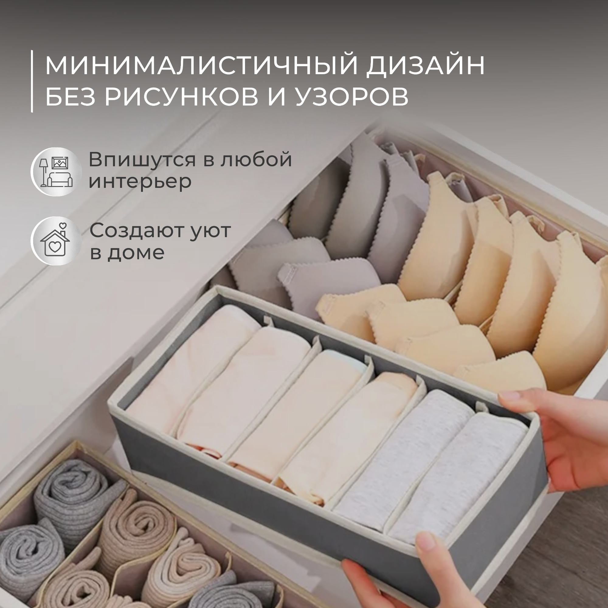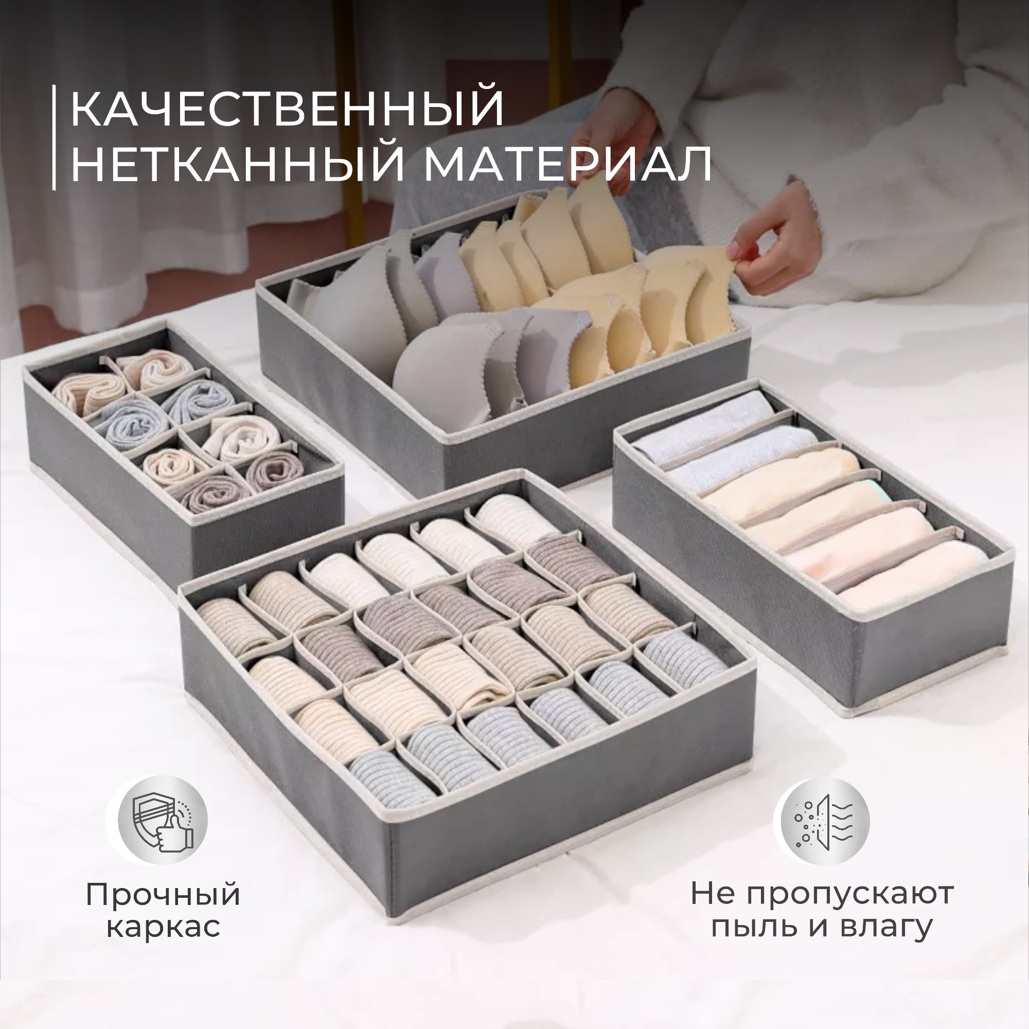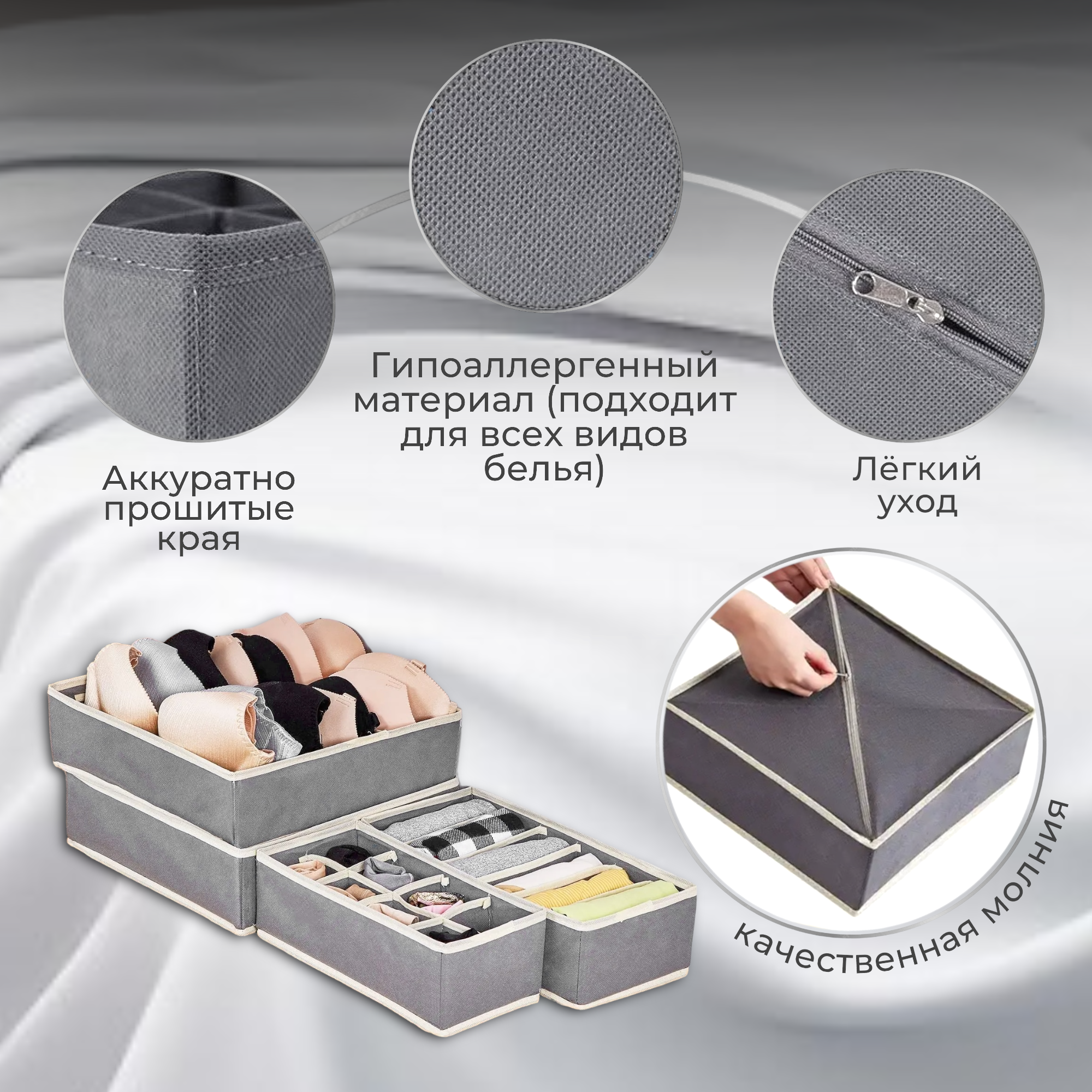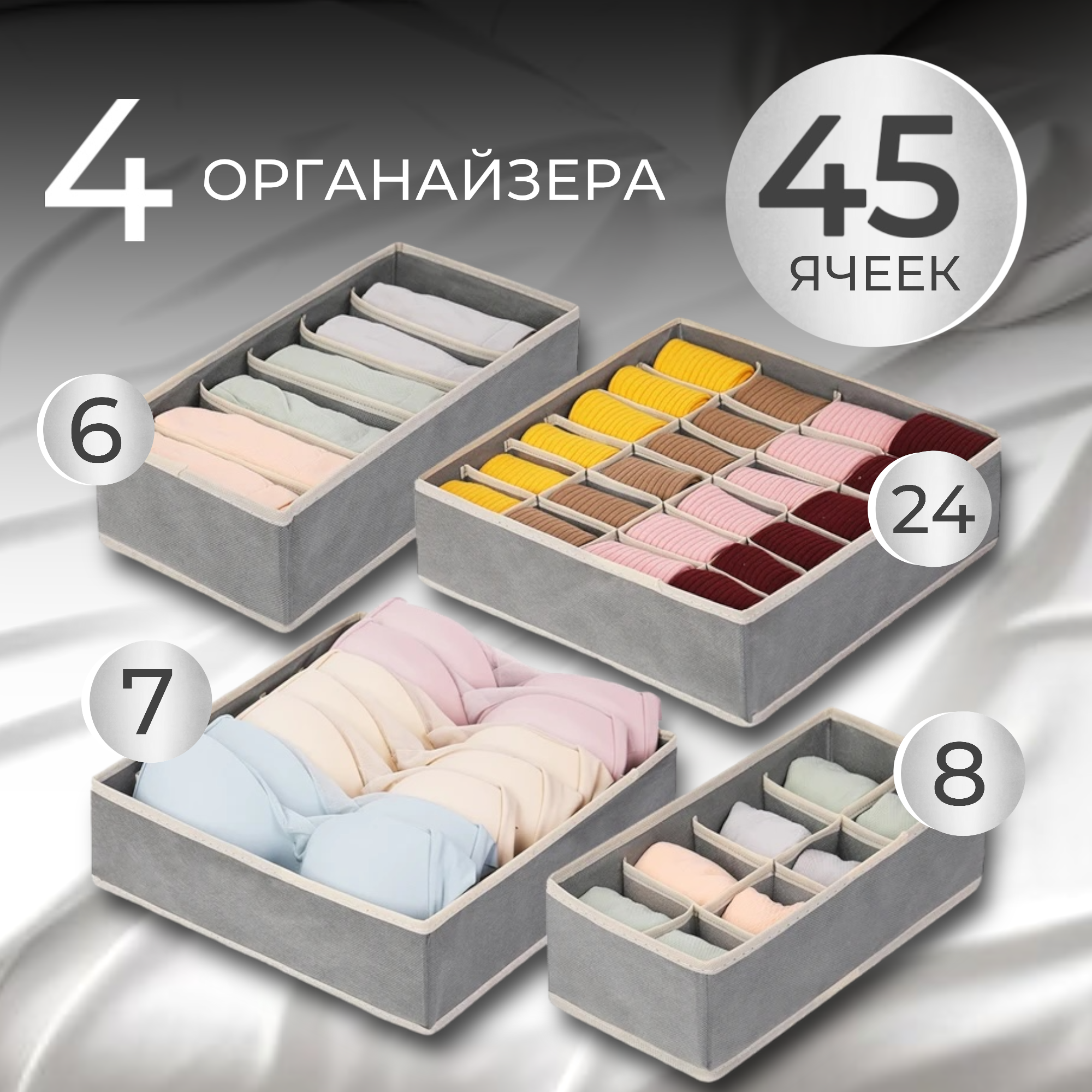 | Комплектация | Кофр для бюстгальтеров 7 ячеек - 1 шт 32х32х9,5см Кофр для носков и галстуков 8 ячеек - 1 шт 32х16х9,5 см Кофр для нижнего белья 24 ячейки - 1 шт 32х32х9,5 см Кофр для шарфов 6 ячеек - 1 шт 32х16х9,5 см |