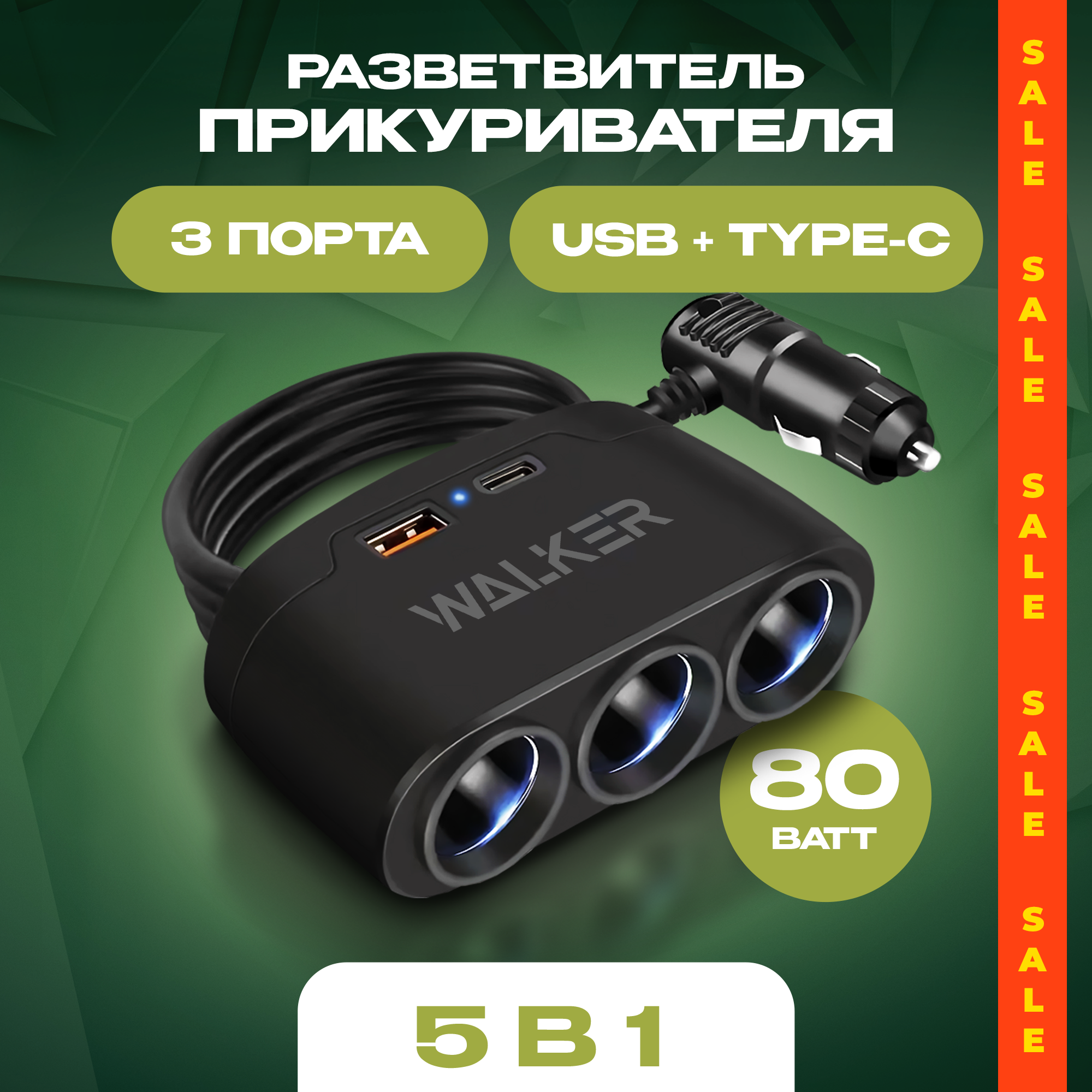 Разветвитель прикуривателя автомобильный, 80Вт, 3 разъема + 1 USB (2.1А) , 1 Type-C, удлинитель в машину, чёрный интересное: