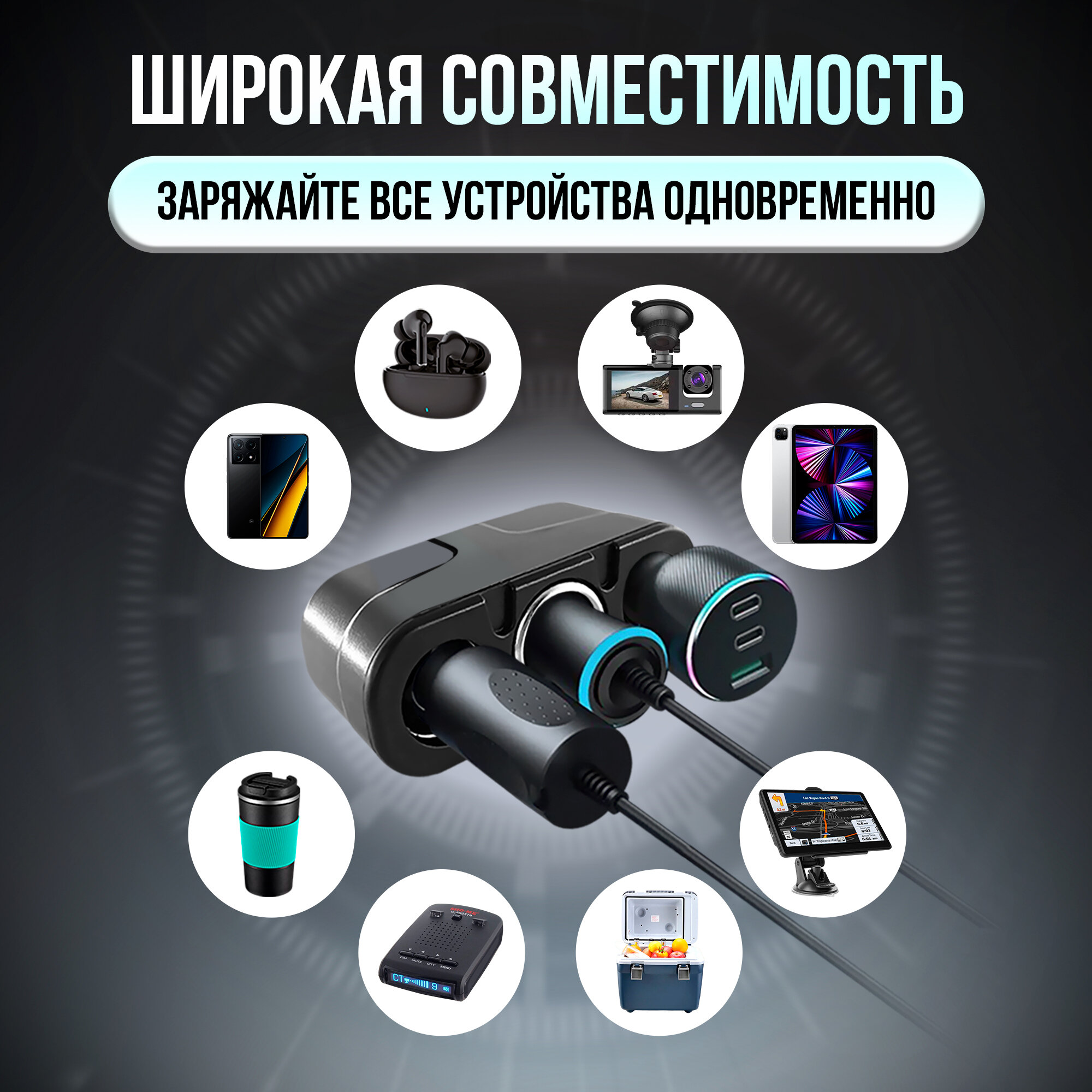Разветвитель прикуривателя автомобильный, 100Вт, 3 разъема, индикатор, поворотная ножка, штекер прикуривателя, черный интересное: