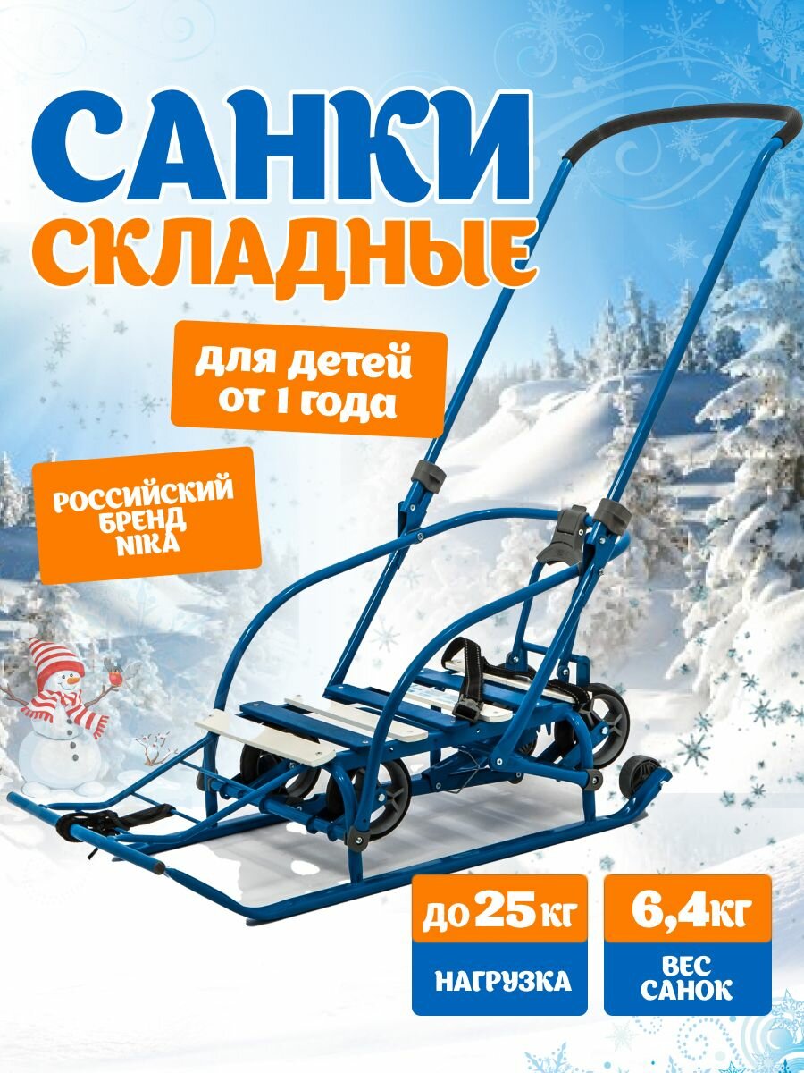 Санки коляска детские зимняя с выдвижными колесами складные NIKKI 3/Г2 голубая рама / для малышей от 1 года Ника интересное: