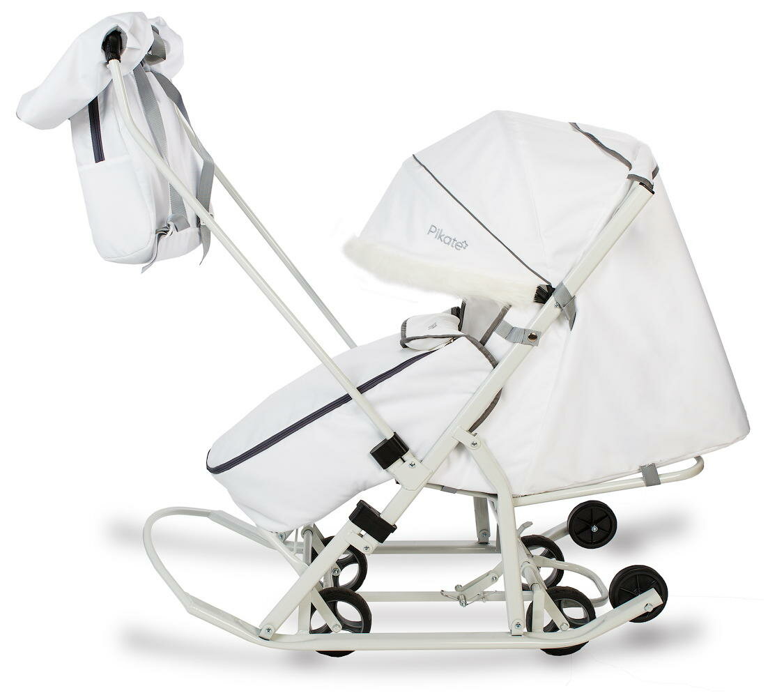 Санки-коляска Pikate Arctic выдвижные колеса, перекидная ручка, сумка для мамы, цвет Белый