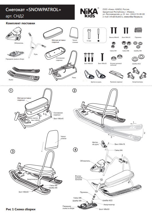 Снегокат Ника-SNOWPATROL (SNOWPATROL 2) рама белая со спинкой, трос авт. нам, велоруль