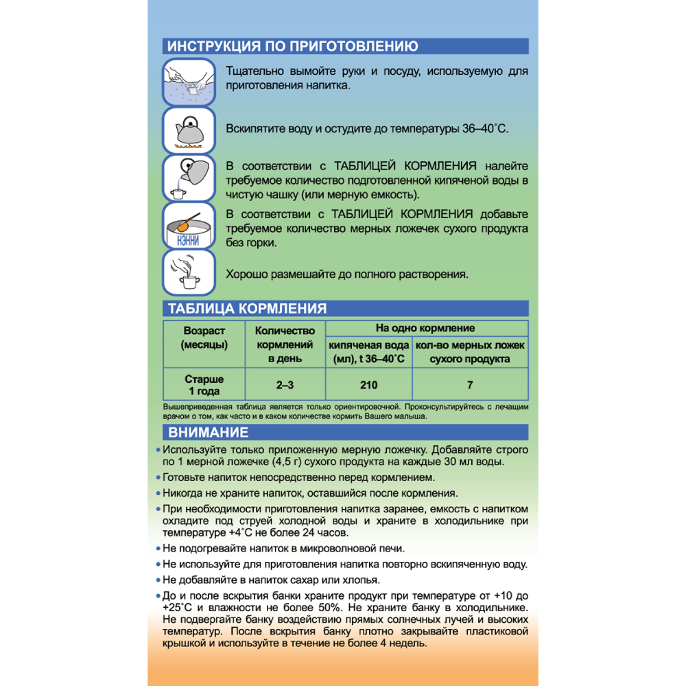 | Состав | молоко цельное козье сухое, лактоза, смесь растительных масел (подсолнечное, каноловое, антиокислитель [концентрат смеси токоферолов]), минеральные вещества (кальций, натрий, железо, цинк, медь, марганец, йод, селен), витамины (С, холин, Е, PP, L-карнитин, пантотеновая кислота, В12, А, К, В1, В6, В2, D, фолиевая кислота, биотин), регулятор кислотности (лимонная кислота), таурин |
