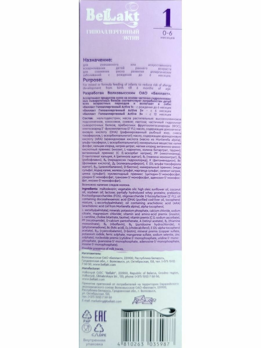 Смесь детская молочная ГА 1 Bellakt Гипоаллергенная Active 1 интересное: