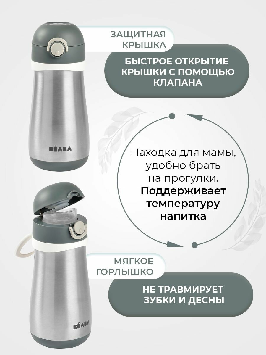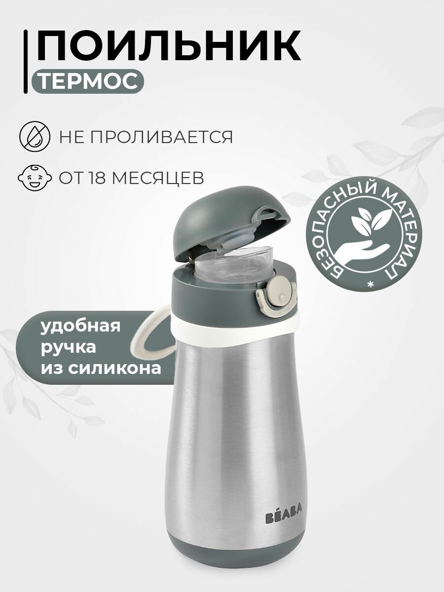 Поильник термос детский BEABA с крышкой, адаптированным носиком, съемной ручкой, термос детский для воды 350 мл., зеленый, эвкалипт