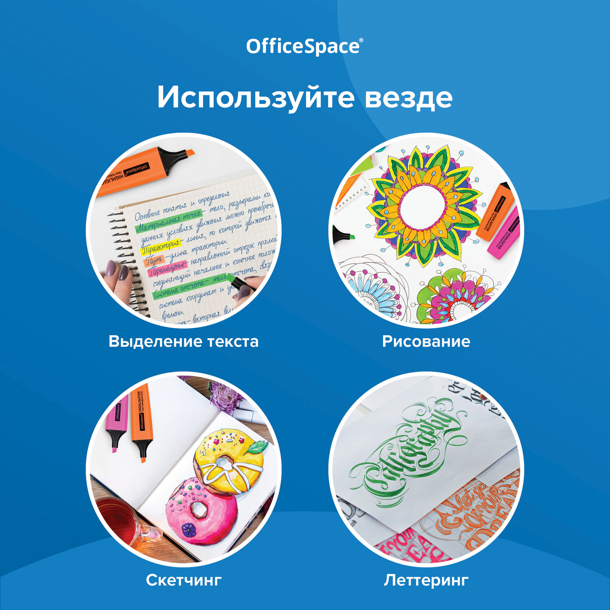 Маркер-текстовыделитель (для выделения текста) Officespace, набор из 4 штук, 4 цвета, линия 1-5 мм, скошенные