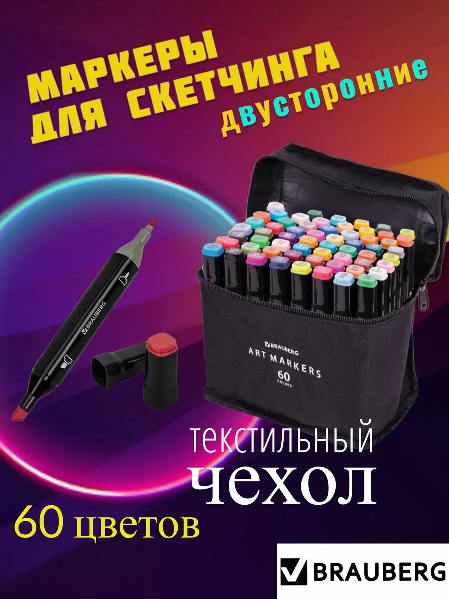 Маркеры для скетчинга Brauberg двусторонние, набор 60 шт, текстильный чехол, ART, 152232
