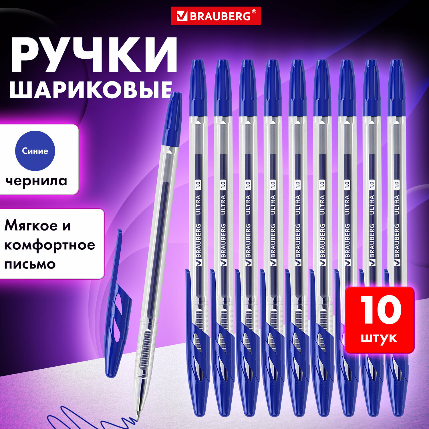 Купить Ручки шариковые Brauberg Ultra, Синие, набор 10 штук, корпус прозрачный, узел 1 мм, 143570
