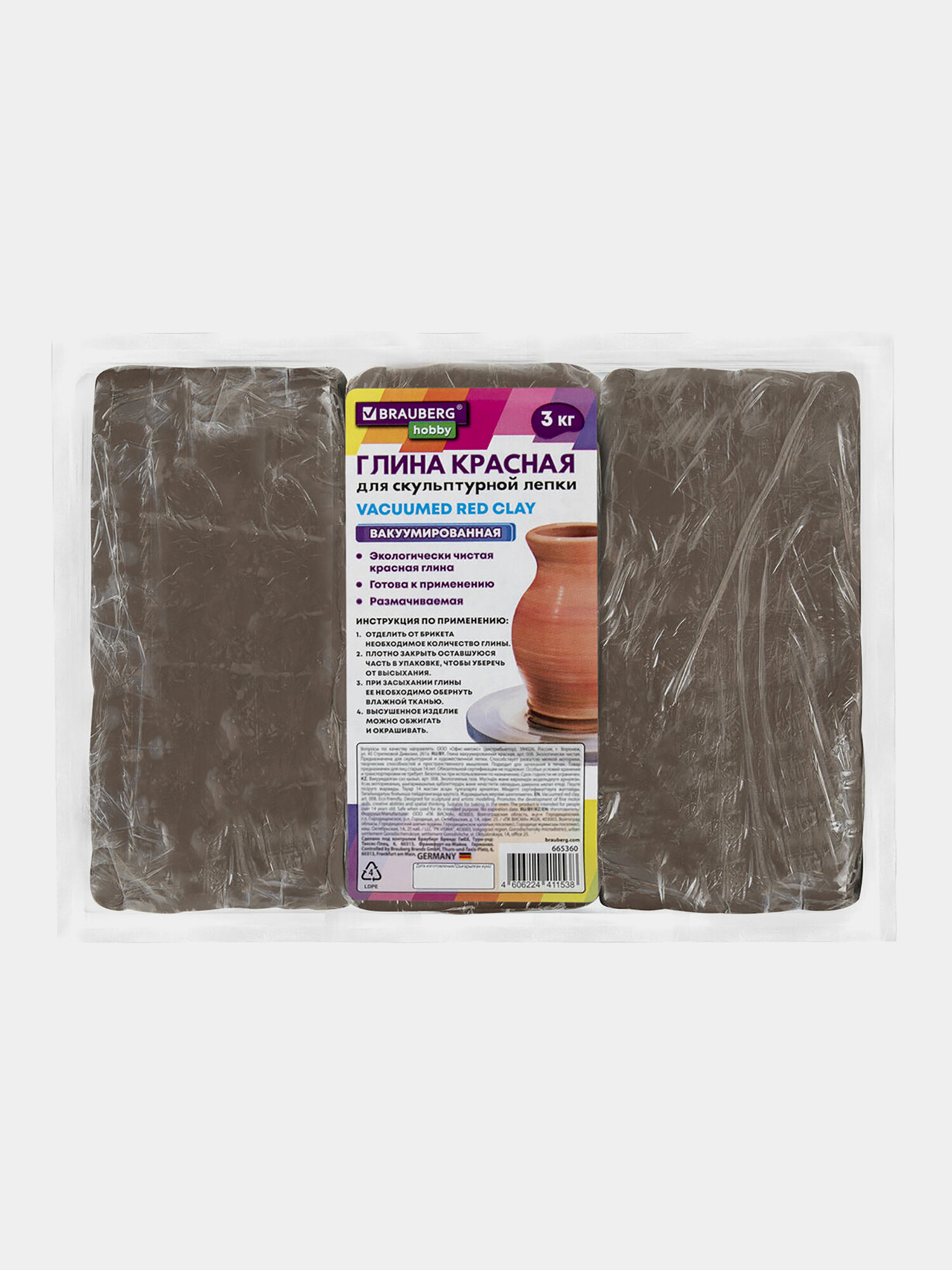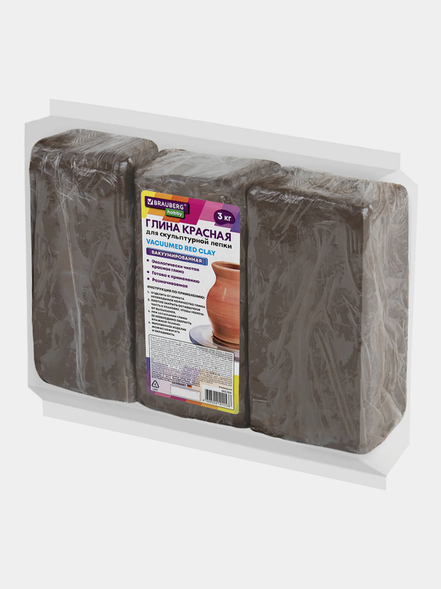 Глина для лепки красная, 3 кг, вакуумированная, готовая, размачиваемая, BRAUBERG HOBBY, 665360 (665360)