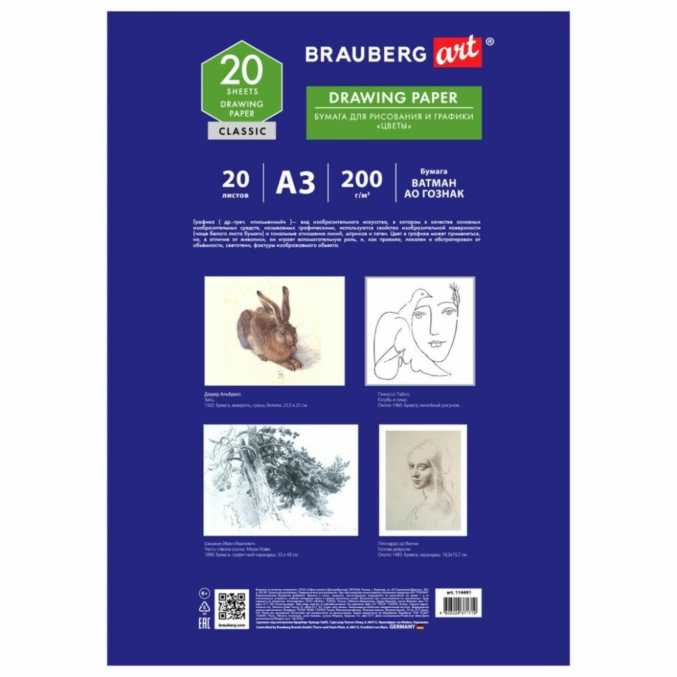 Бумага для рисования и графики А3, 50 л., 200 г/м2, ватман гознак, BRAUBERG ART CLASSIC, 114490