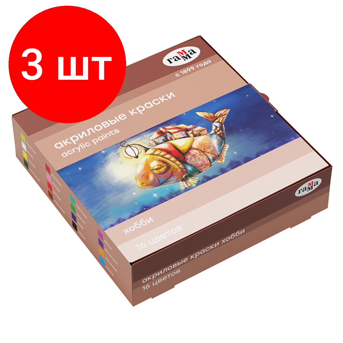 Купить Комплект 3 шт, Краски акриловые декоративные Гамма "Хобби", 16 цветов, 20мл, картон. упаковка