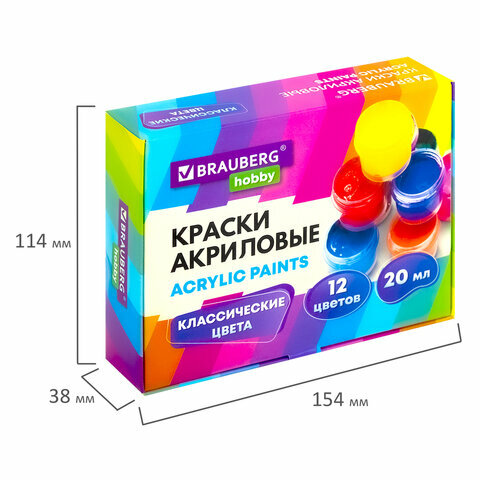Краски акриловые для рисования и творчества 12 цветов по 20 мл, BRAUBERG HOBBY, 192435