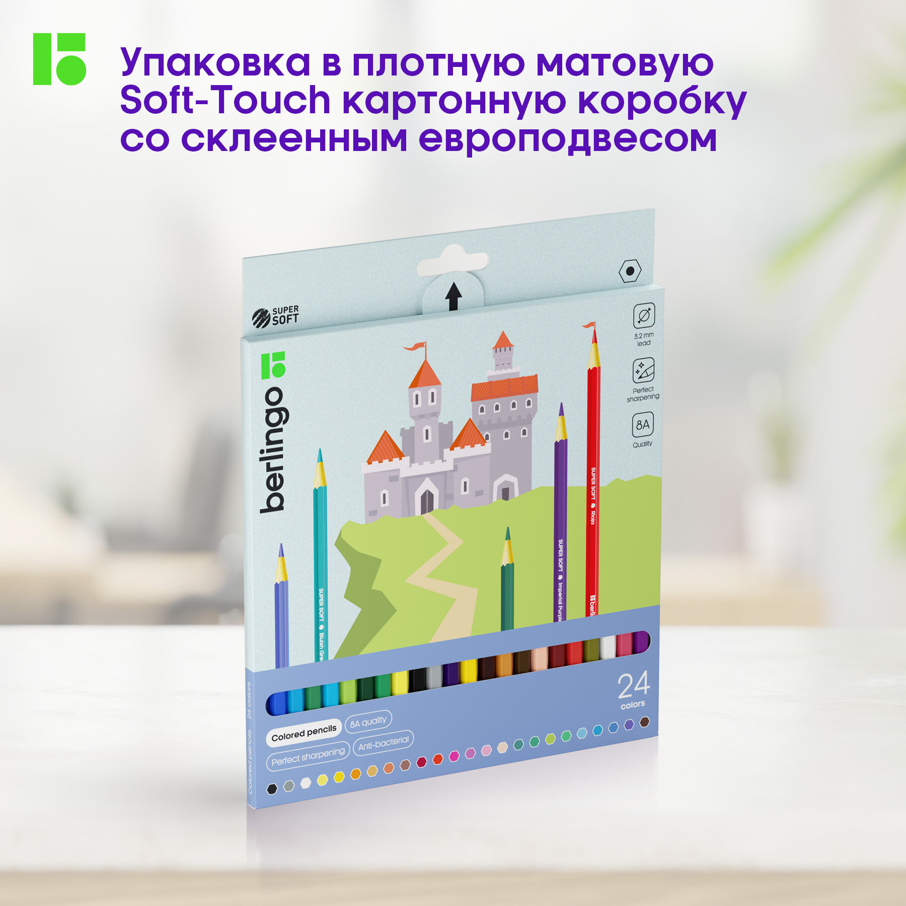 Карандаши цветные 24 цвета Berlingo "SuperSoft. Замки" (L=180мм, D=7мм, d=3.2мм, 6гр) картон, европодвес (SS00124), 6 уп.