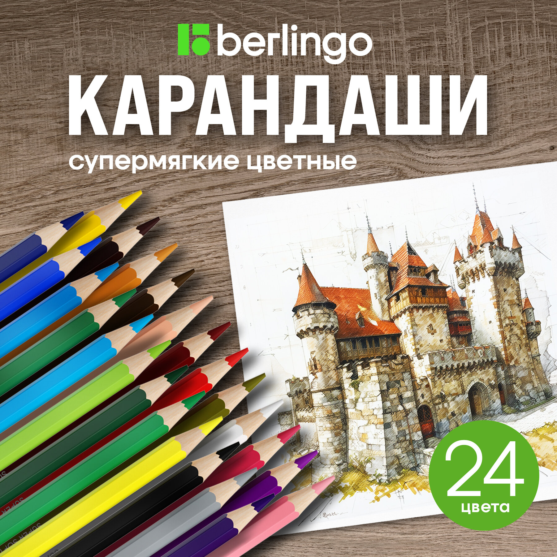Карандаши цветные Berlingo "SuperSoft. Замки", 24цв., заточен., картон, европодвес (арт. 297232)