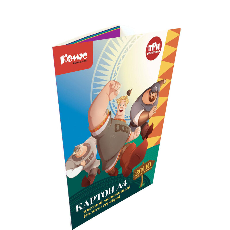Цветной картон Комус Три Богатыря, А4, 20 листов, 8 цветов, золотистый и серебряный, мелованный