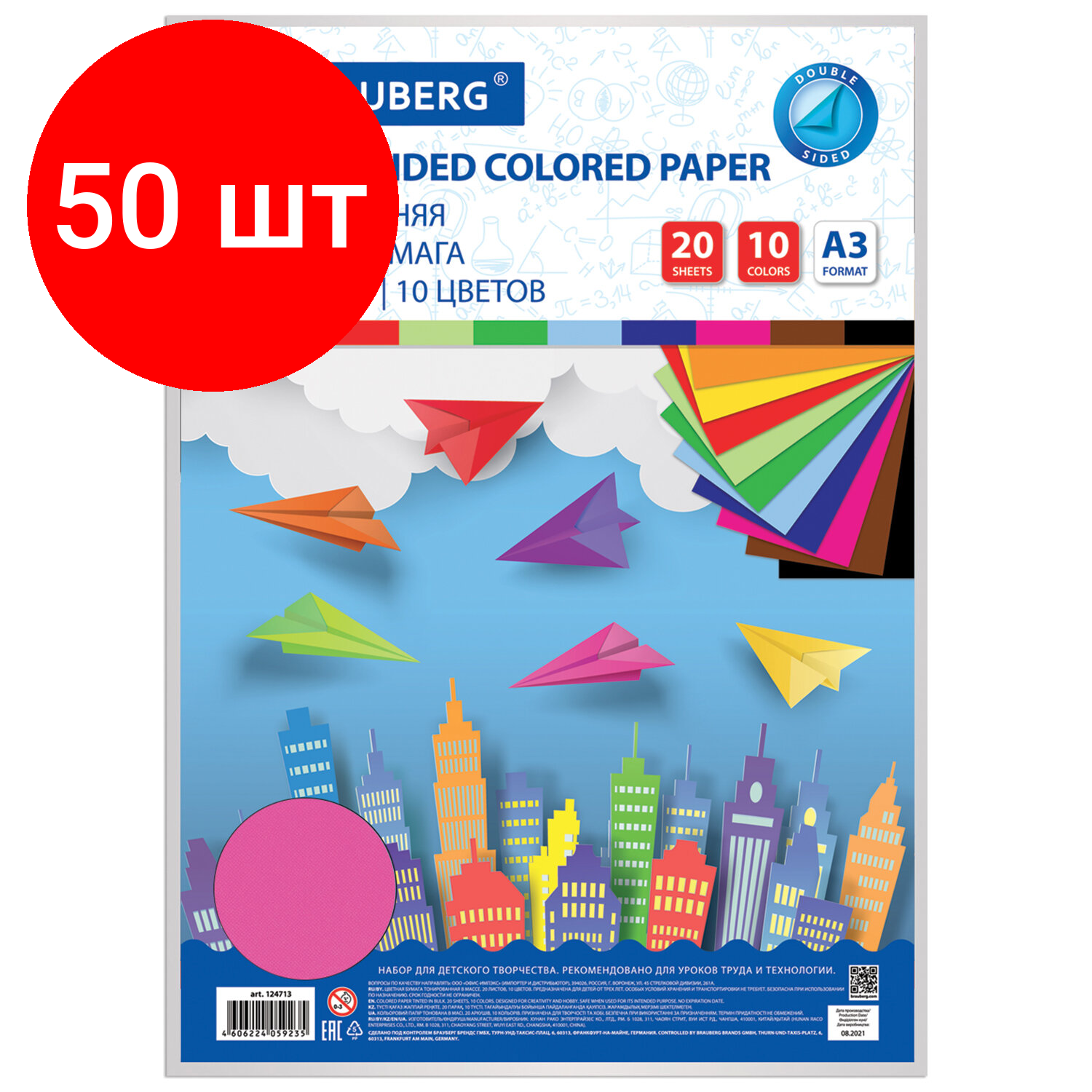 Бумага цветная двусторонняя тонированная Brauberg (20 листов, 10 цветов, А3, 297х420мм) (124713), 50 уп.
