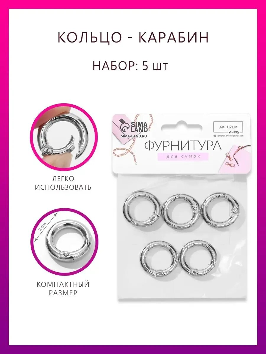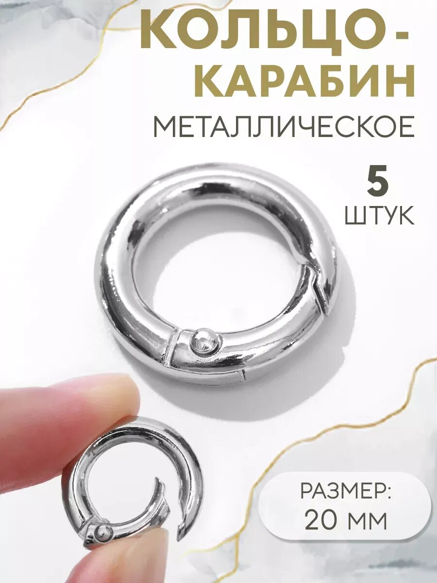 Кольцо-карабин, d = 13/20 мм, толщина - 3,5 мм, 5 шт, цвет серебряный