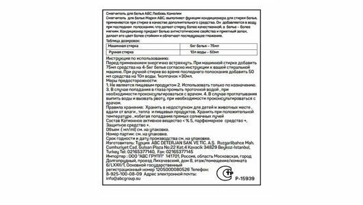 | Способ применения | перед применением энергично встряхнуть. После стирки обычным порошком добавьте кондиционер в воду для последнего полоскания белья. Для лучшего результата не полощите белье после использования кондиционера. Для ручной стирки и стиральных машин активаторного типа: добавьте 2/3 колпачка в 10–15л воды, опустите белье в раствор, отожмите и высушите. Для автоматических стиральных машин добавьте 1 колпачок во время последнего полоскания белья |