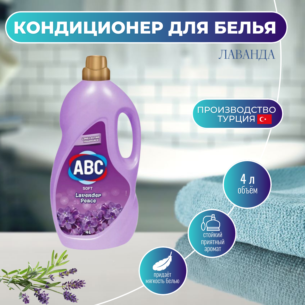 Кондиционер для белья АВС Лавандовый мир 4л, 40 стирок, смягчитель для белья / Турция