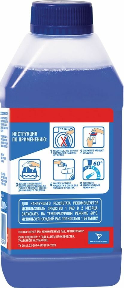 | Способ применения | убедитесь, что внутри стиральной машины нет белья. Открутите крышку. Добавьте небольшое количество средства на губку и протрите отсеки для моющего средства и ополаскивателя. Залейте остаток жидкости в отсек для моющего средства. Запустите температурный режим 60⁰. Для наилучшего результата рекомендуется запускать 2 пустых цикла в год при температурном режиме 60⁰, используя каждый раз 1 бутылку |