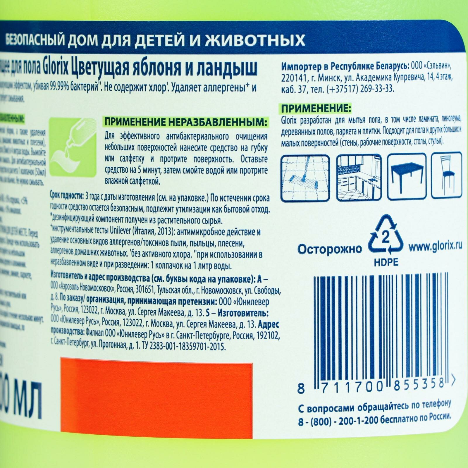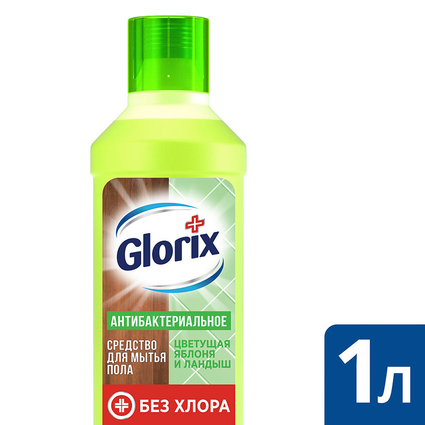 Средство для мытья пола Глорикс Цветущая яблоня и Ландыш удаляет бактерии и препятствует налипанию пыли, 1 л