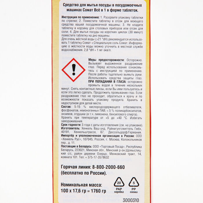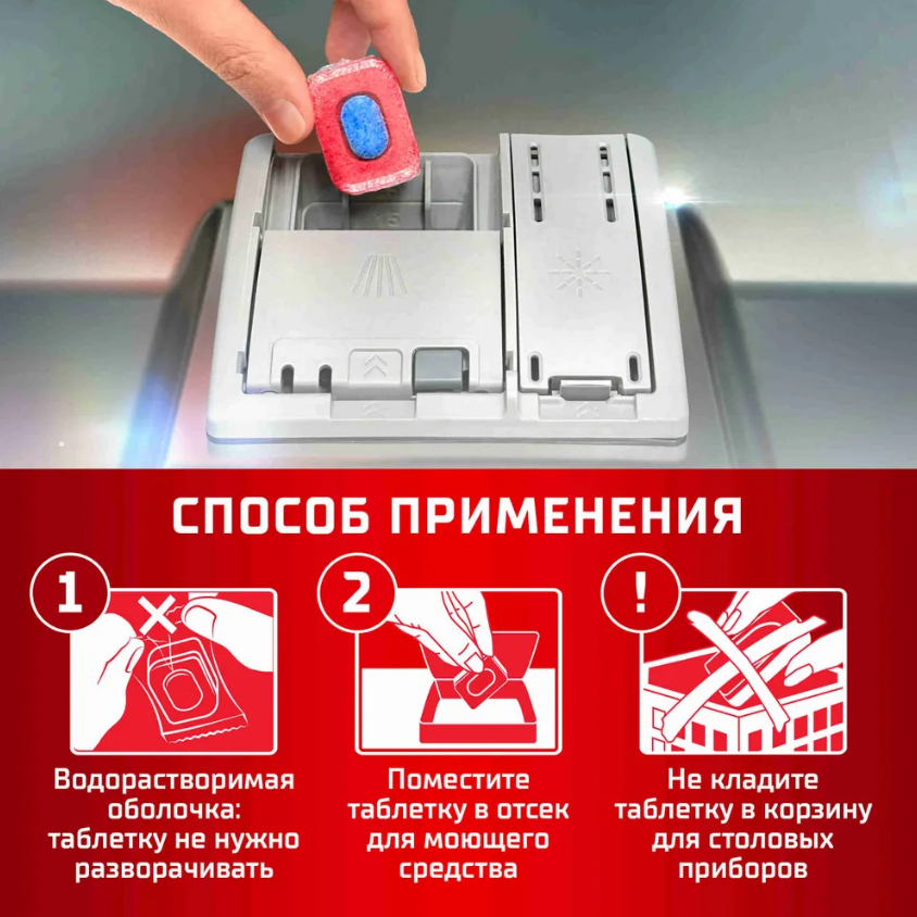 | Способ применения | Загрузите посуду в посудомоечную машину. Положите таблетку в отсек для моющего средства посудомоечной машины. Запустите моющий режим посудомоечной машины. Не водорастворимая оболочка таблетки, оболочку надо снимать |