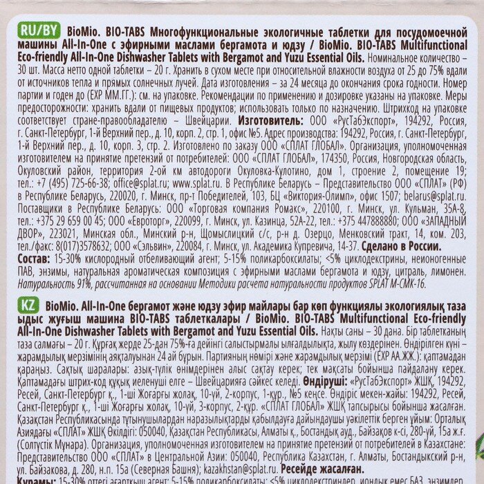 BioMio. таблетки для посудомоечной машины с эфирными маслами бергамота и юдзу 30 шт