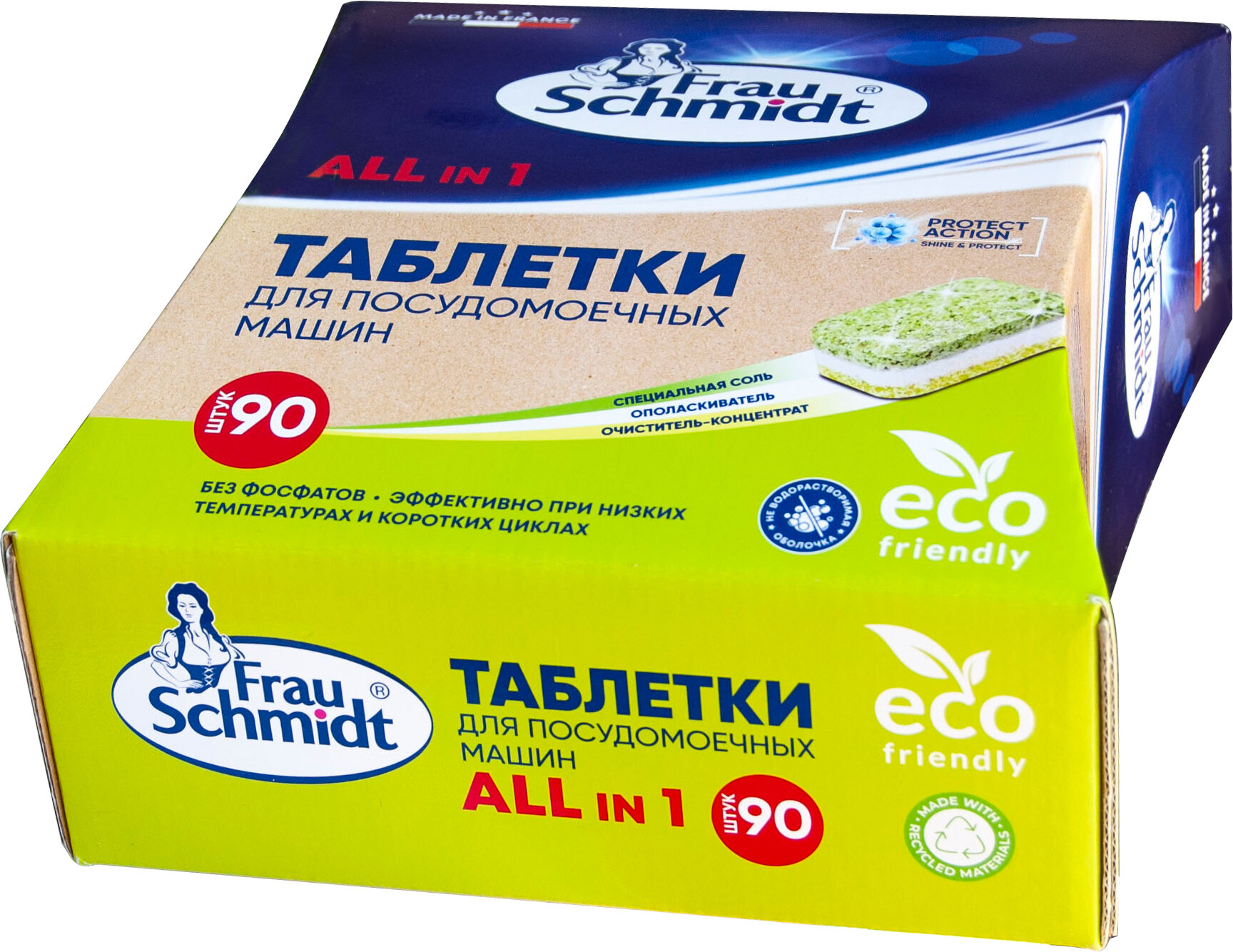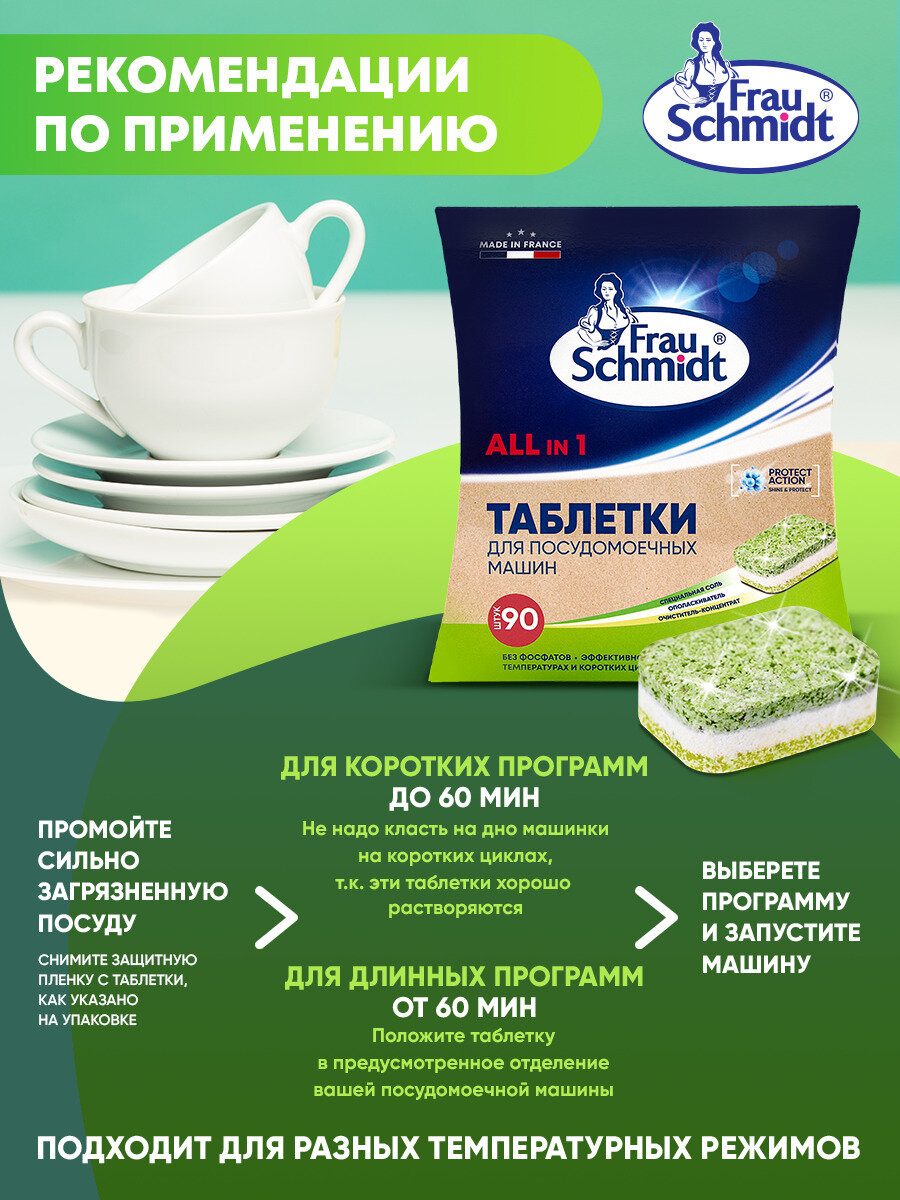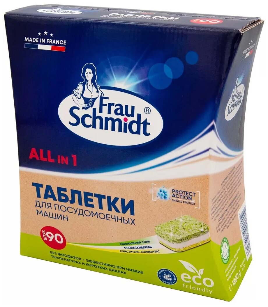 Frau Schmidt Эко Таблетки с функцией соли и ополаскивателя для мытья посуды в посудомоечной машине "Все в 1" без фосфатов 90 таб