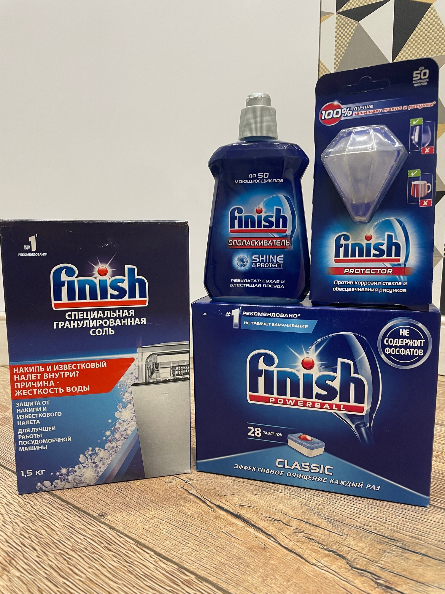 Набор для посудомоечной машины. Таблетки для ПММ Finish Powerball Classic. 28 шт. Польша; Ополаскиватель Shine & Protect. 250 мл. Польша. Гранулированная соль. 1.5 кг и Finish Protector. 30 г. Венгрия. интересное: