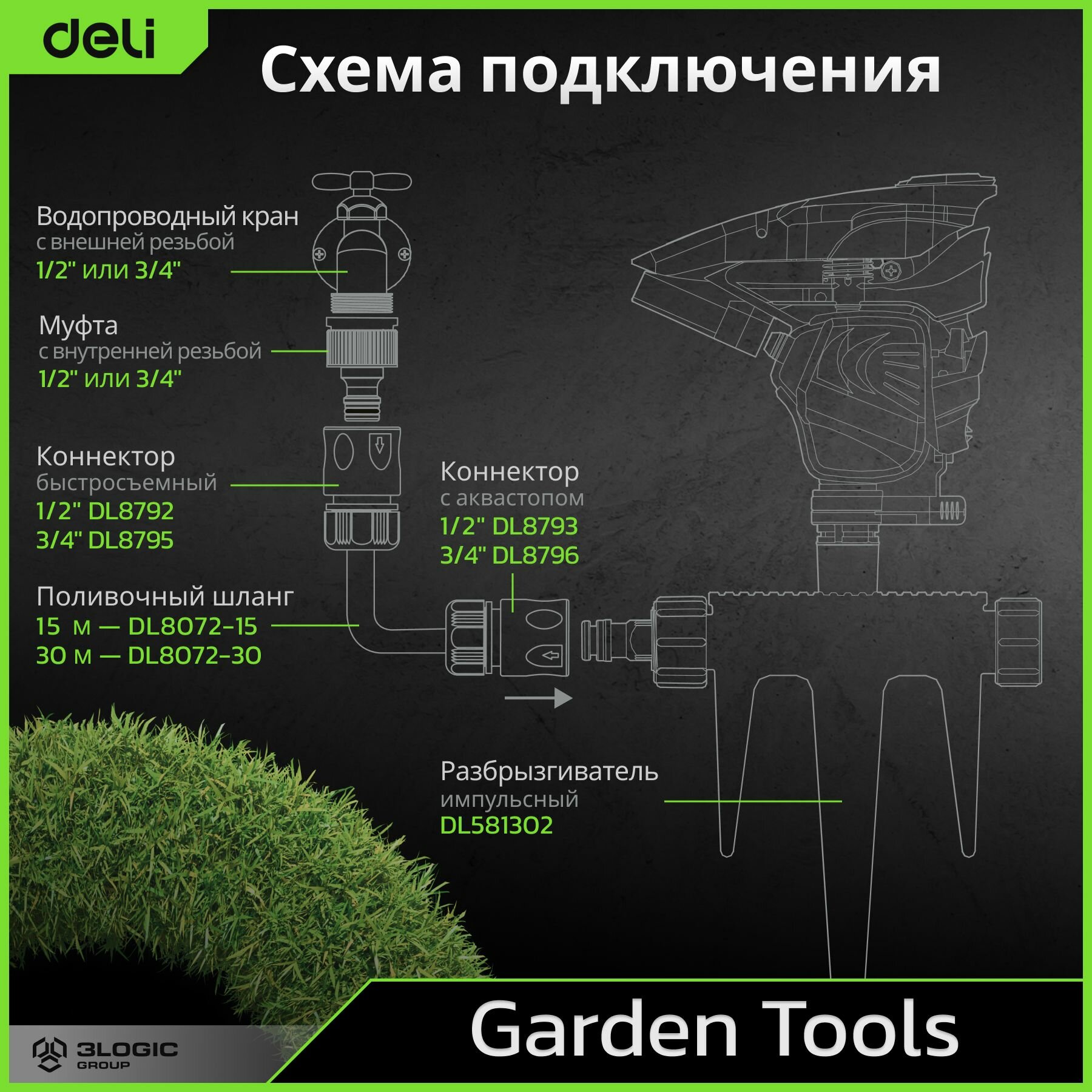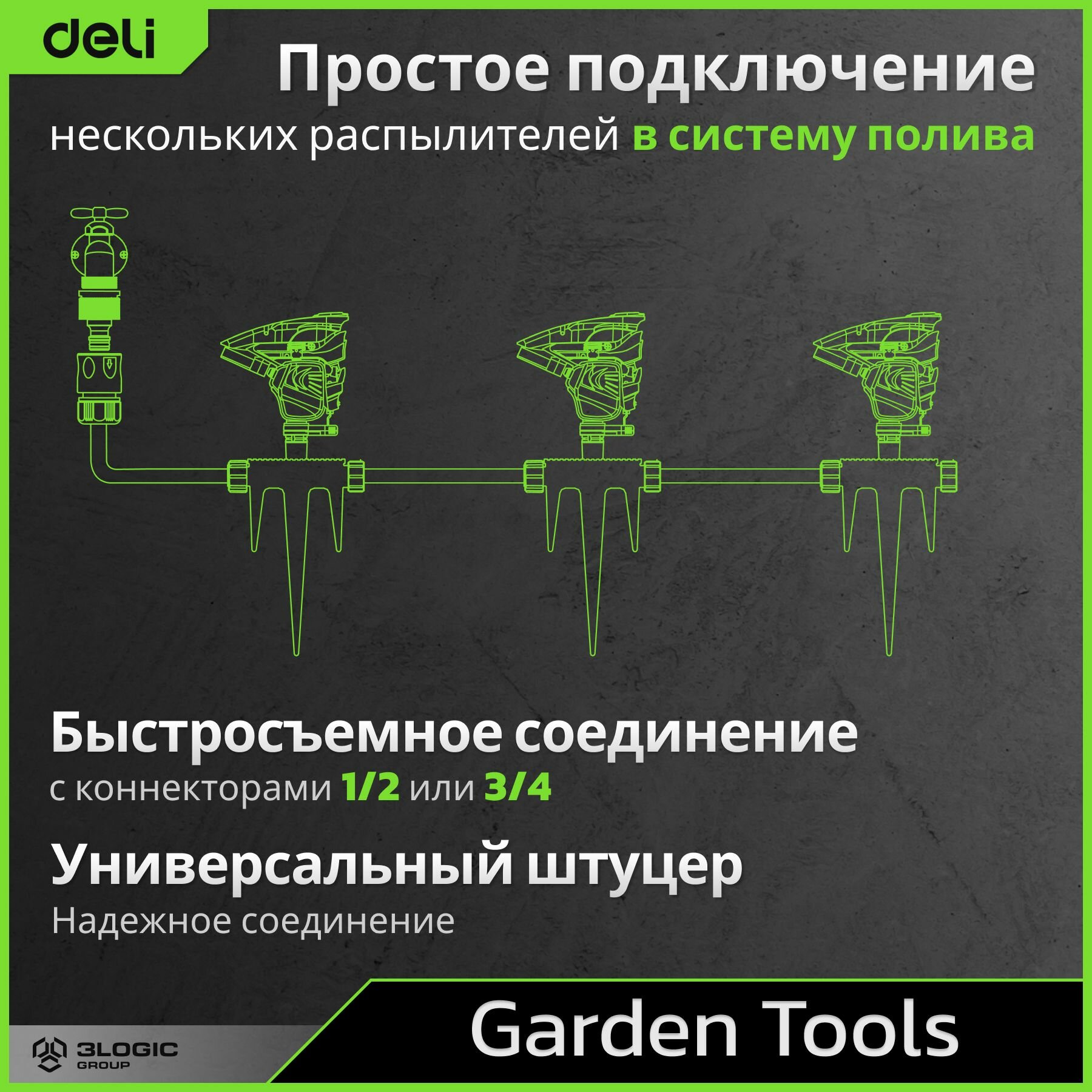 Дождеватель-разбрызгиватель импульсный на 3-х пиках Deli DL581302 площадь орошения до 380кв.м, сектор полива 0-360 град, ударопрочный пластик интересное: