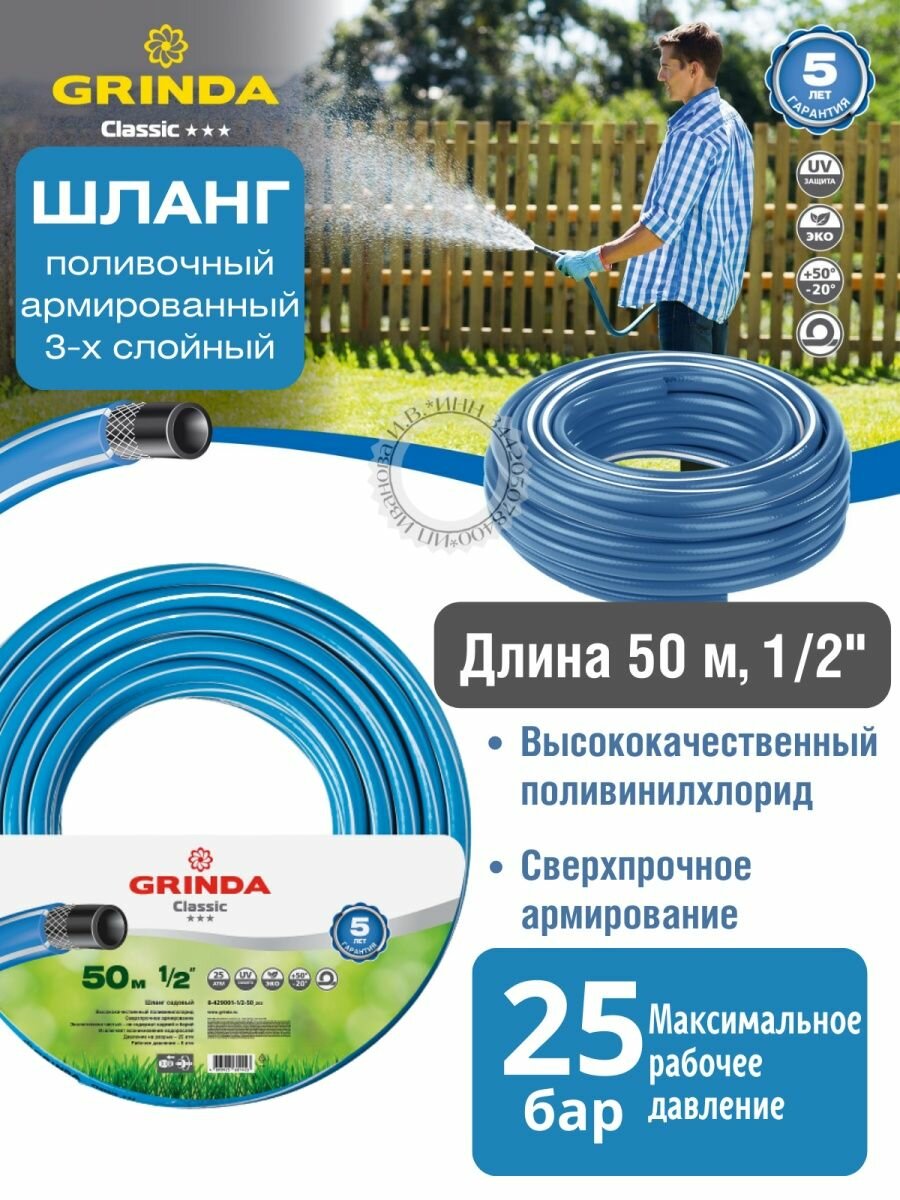 GRINDA Шланг GRINDA CLASSIC поливочный, 25 атм., армированный, 3-х слойный, 1/2"х50м, ( 8-429001-1/2-50_z02 ) интересное: